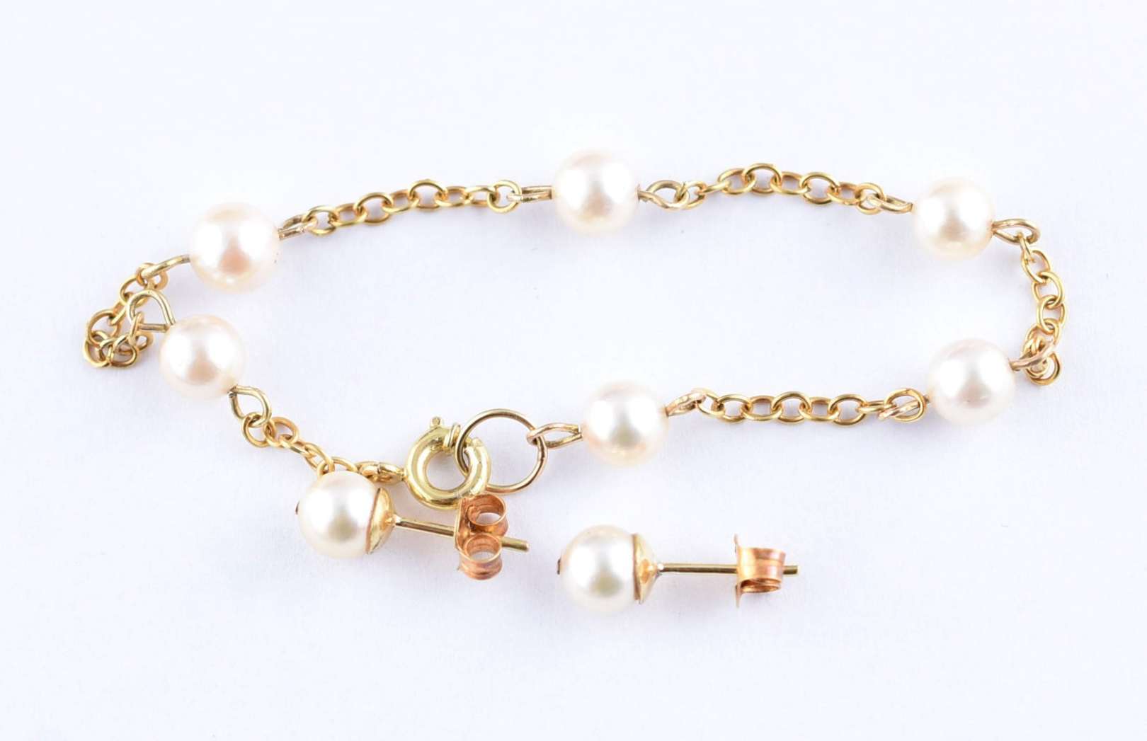 Conjunto em ouro 18 k composto de pulseira feitio corrente com 6 perolas cultivadas e par de brincos de perolas japonesa (Por motivos de seguranças as peças não encontram-se na loja)