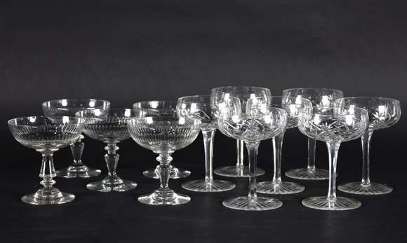 Lote com 12 taças para champagne de cristal frances, sendo 7 lapidadas Baccarat com fundo apresentando estrela de 24 ...