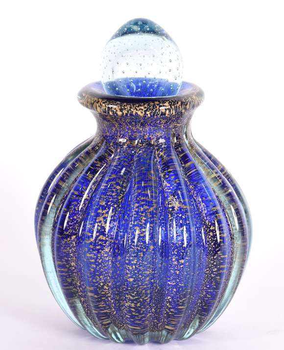 Garrafa de vidro decorativo em gomos nas cor azul com tampa.