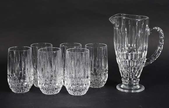 Conjunto em demi cristal composto de: 6 copos e jarra para refresco. Total 7 peças.