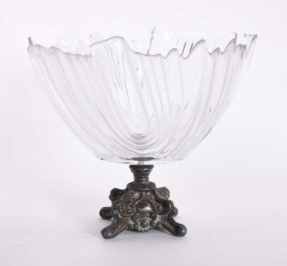 Centro de mesa com base de metal e bowl de cristal com borda recortada.