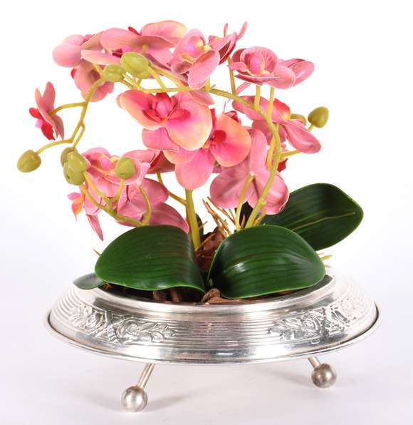 Pequeno cachepot com banho de prata com composição floral de orquídeas permanentes.