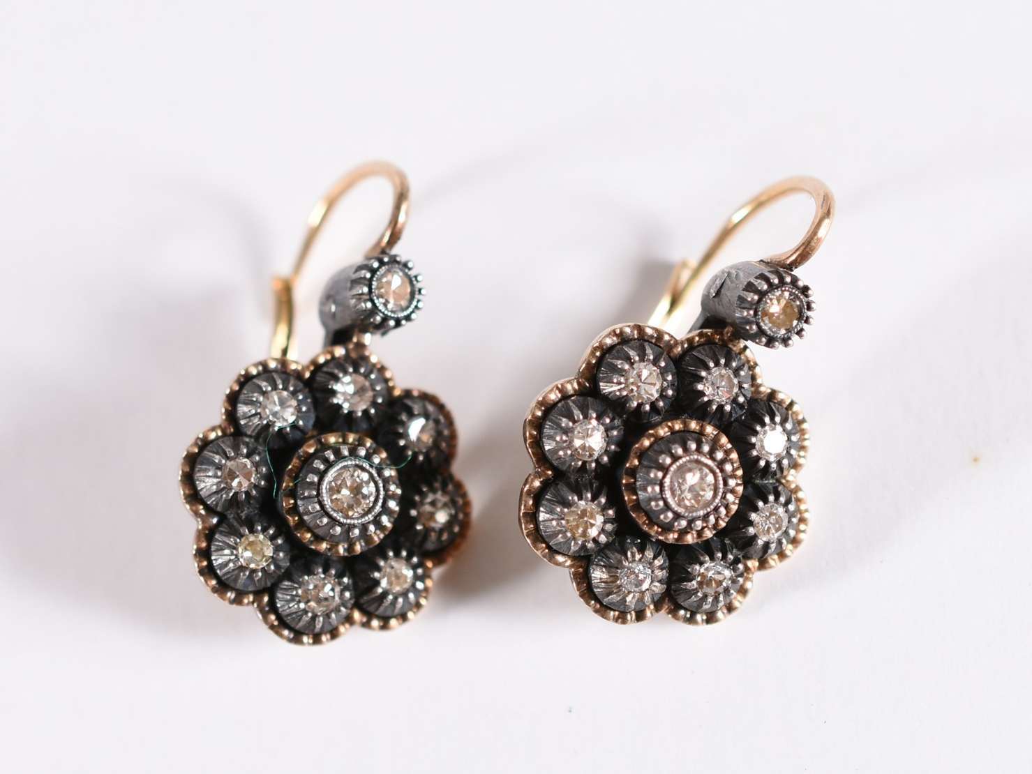Par de broches, grandes "moscas" em ouro 18 k e ouro branco, com brilhantes, 1 perola e olhos com rubilitas (Por mot...