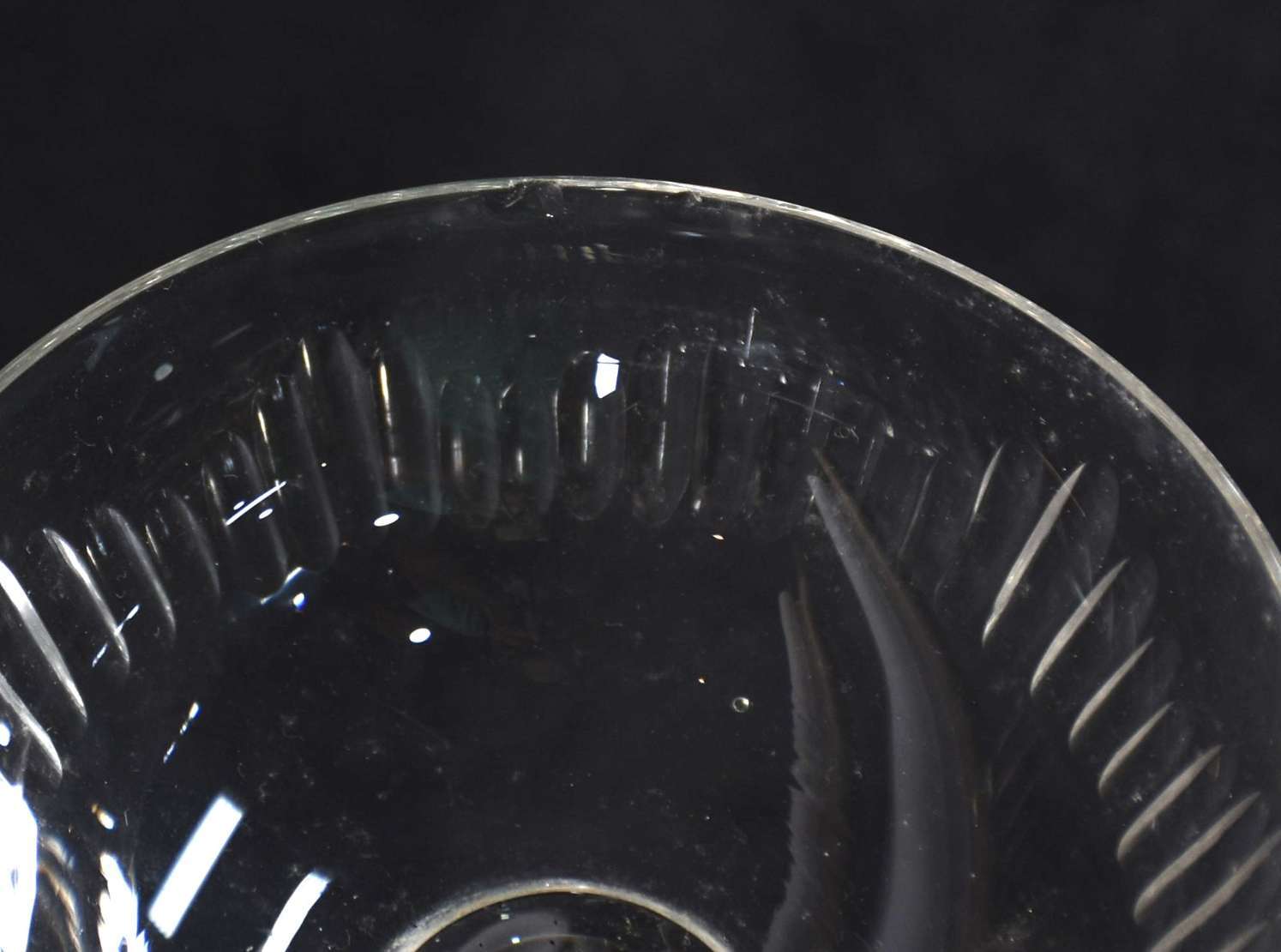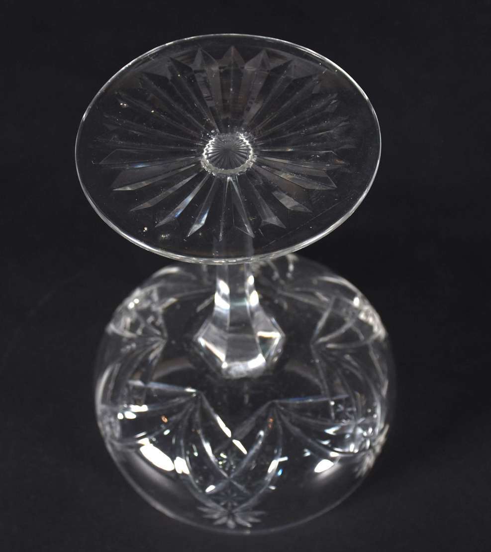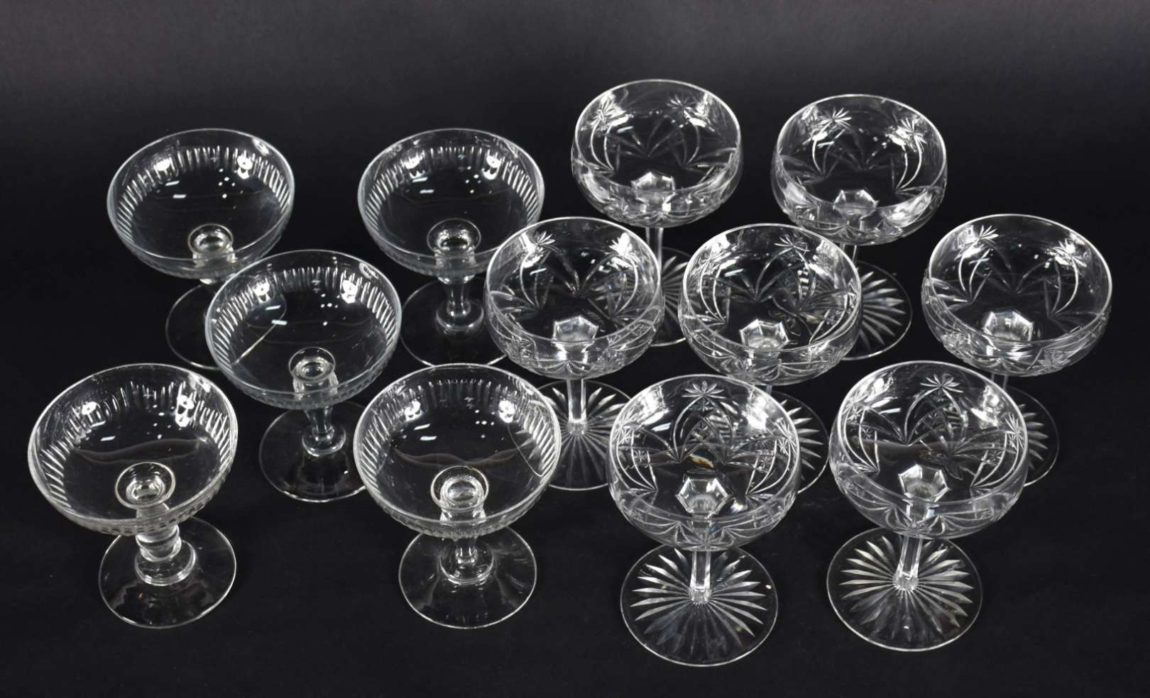 Lote com 12 taças para champagne de cristal frances, sendo 7 lapidadas Baccarat com fundo apresentando estrela de 24 pontas e 5 em gomos lapidados.