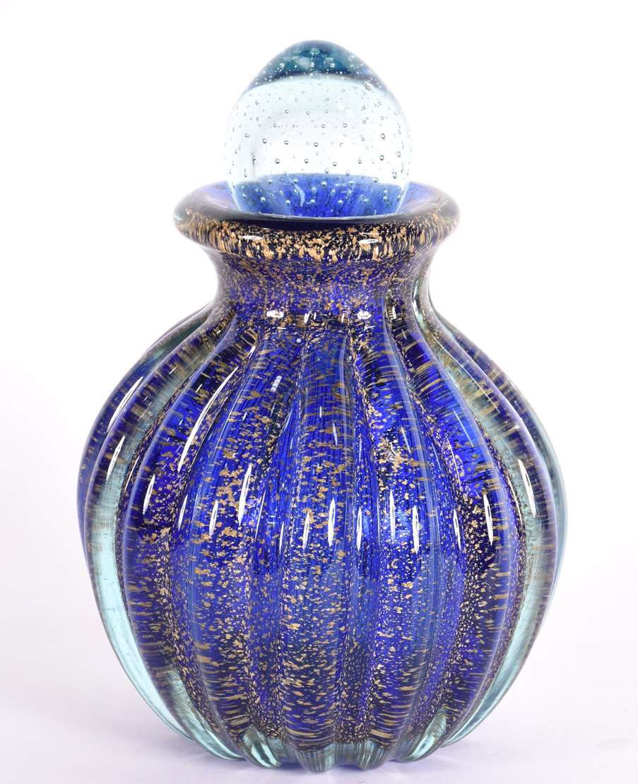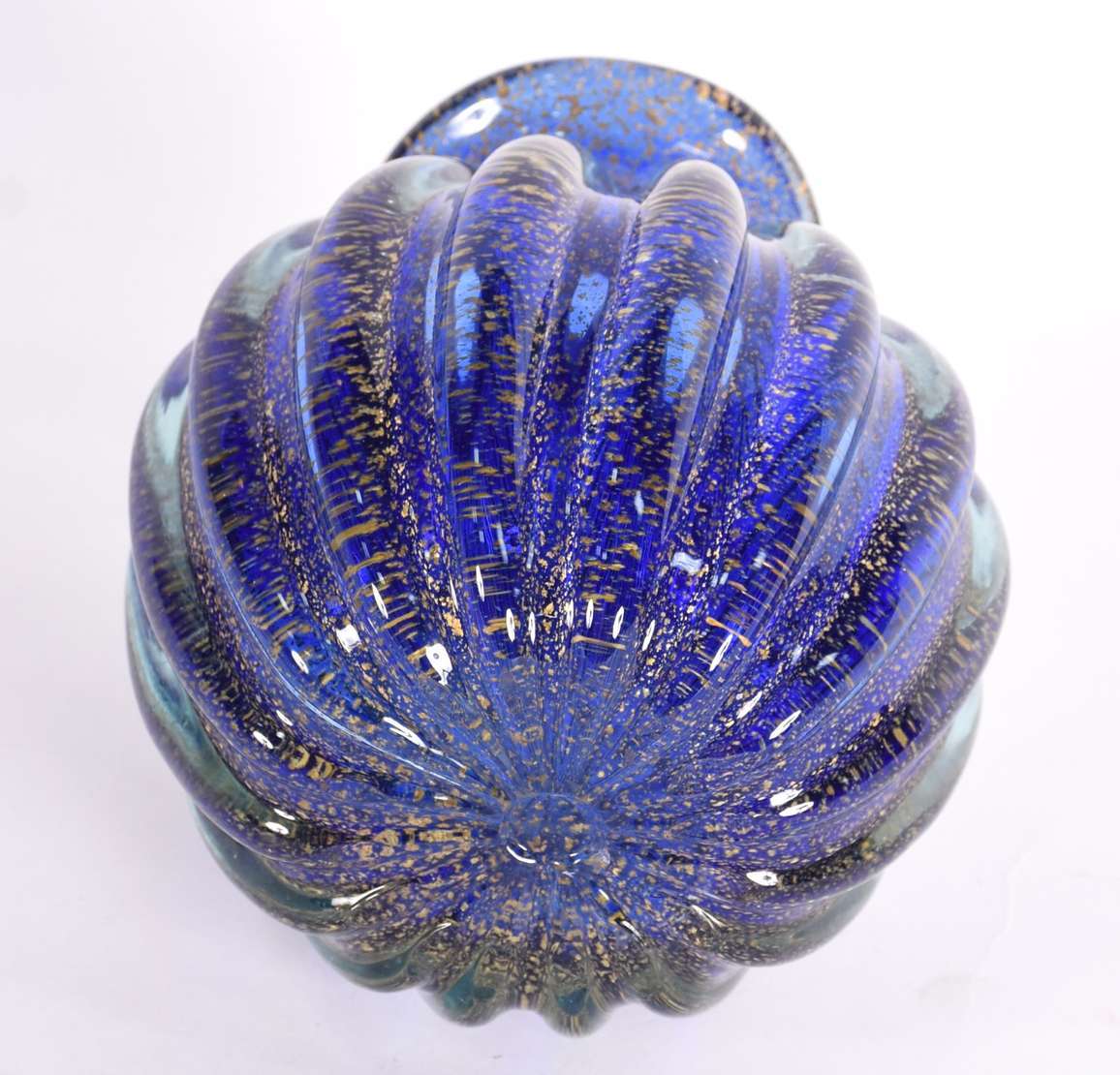 Fruteira de vidro decorativo na cor azul com pó de ouro.