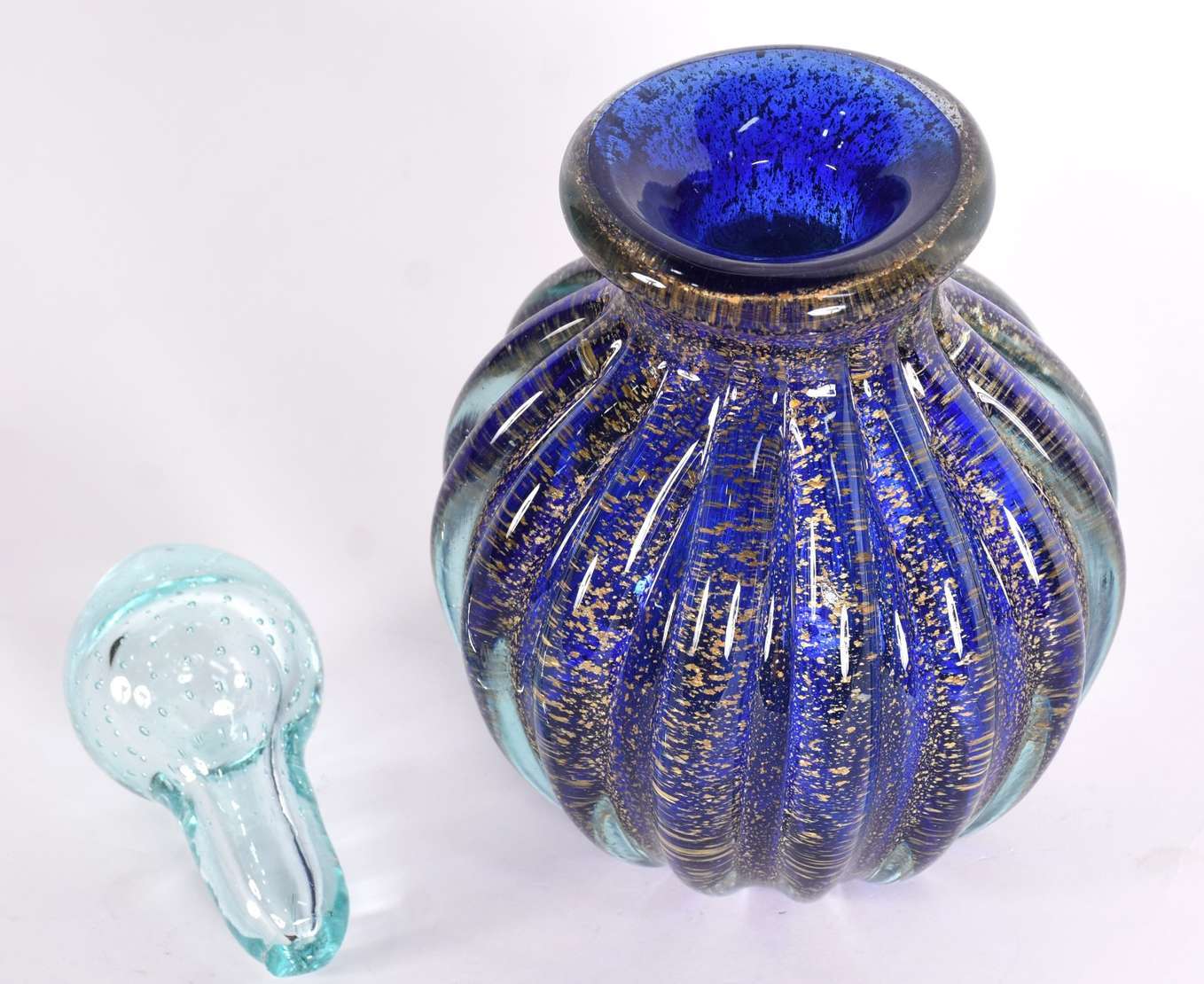 Garrafa de vidro decorativo em gomos nas cor rosa com tampa.