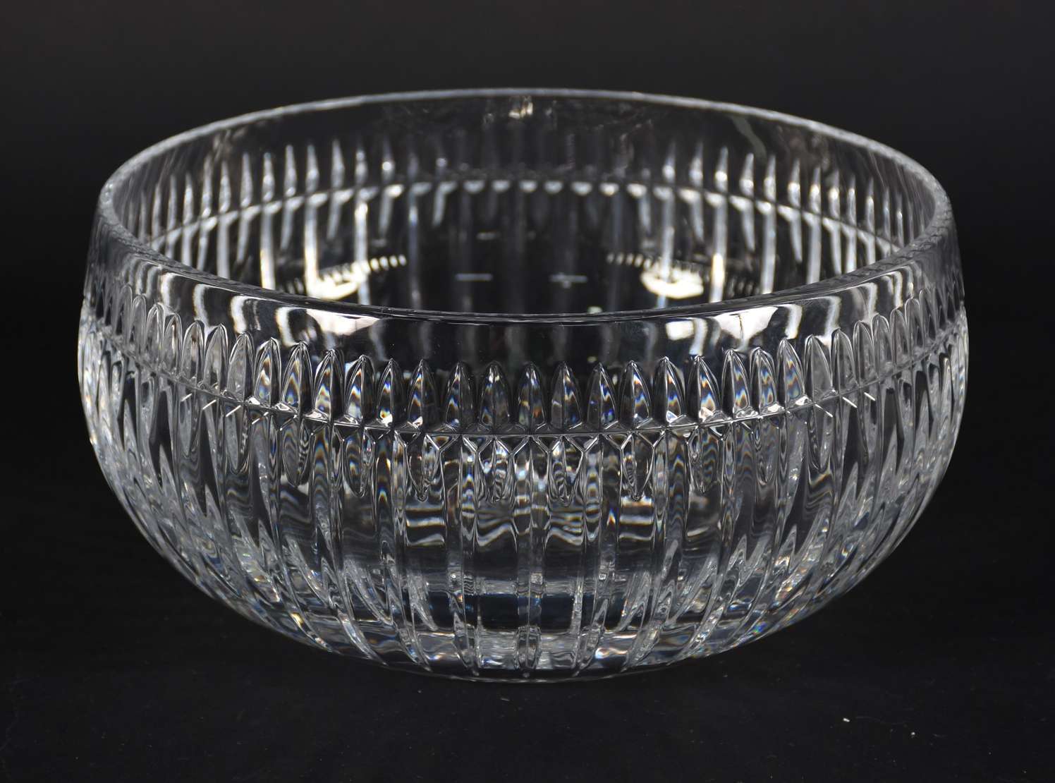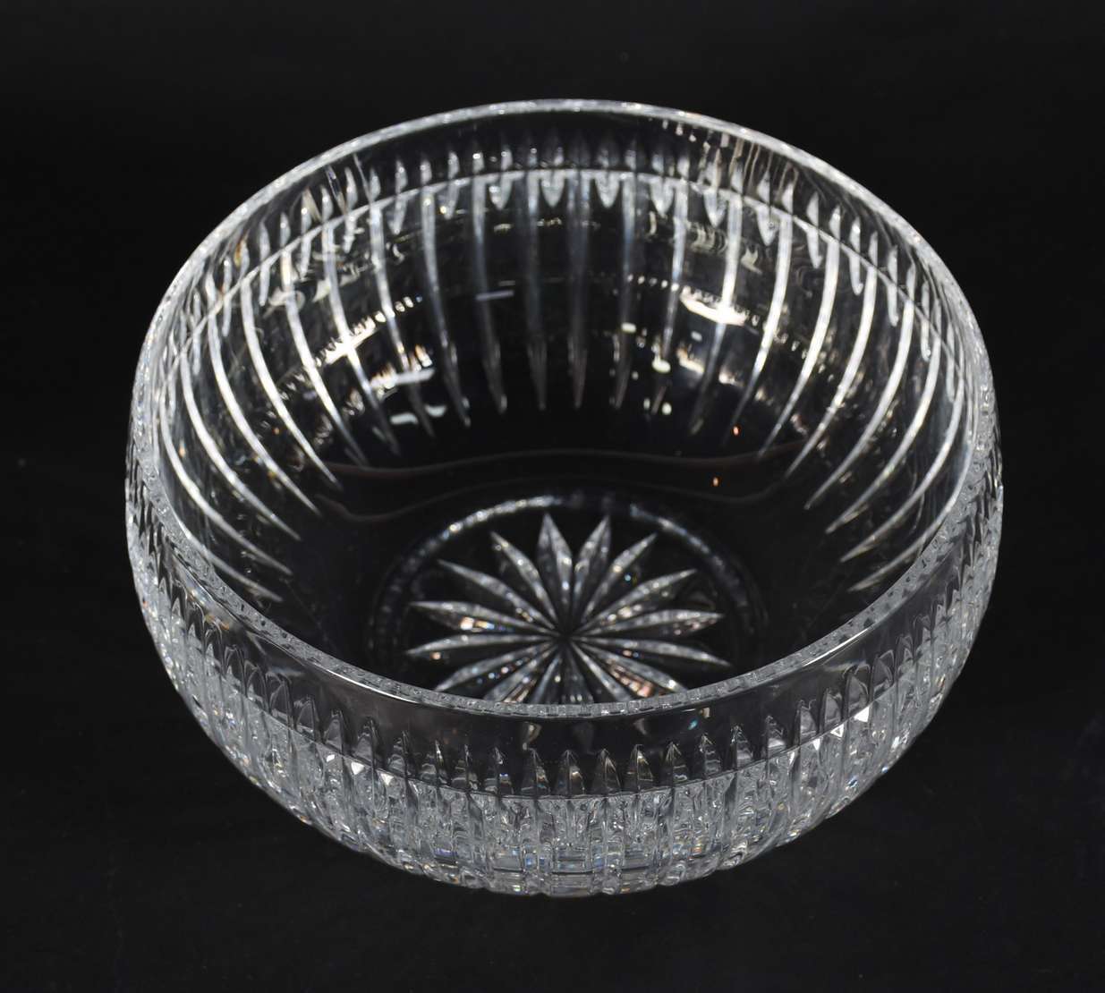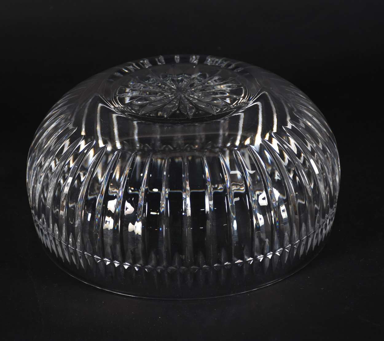 Centro de mesa com base de metal e bowl de cristal com borda recortada.