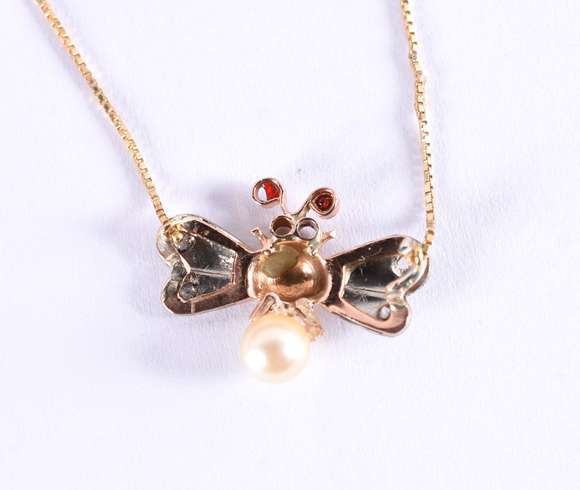 Cordão veneziano com pingente feitio abelinha em dois tons de ouro 18 k, apresenta perola, rubi e brilhantes (Por mot...