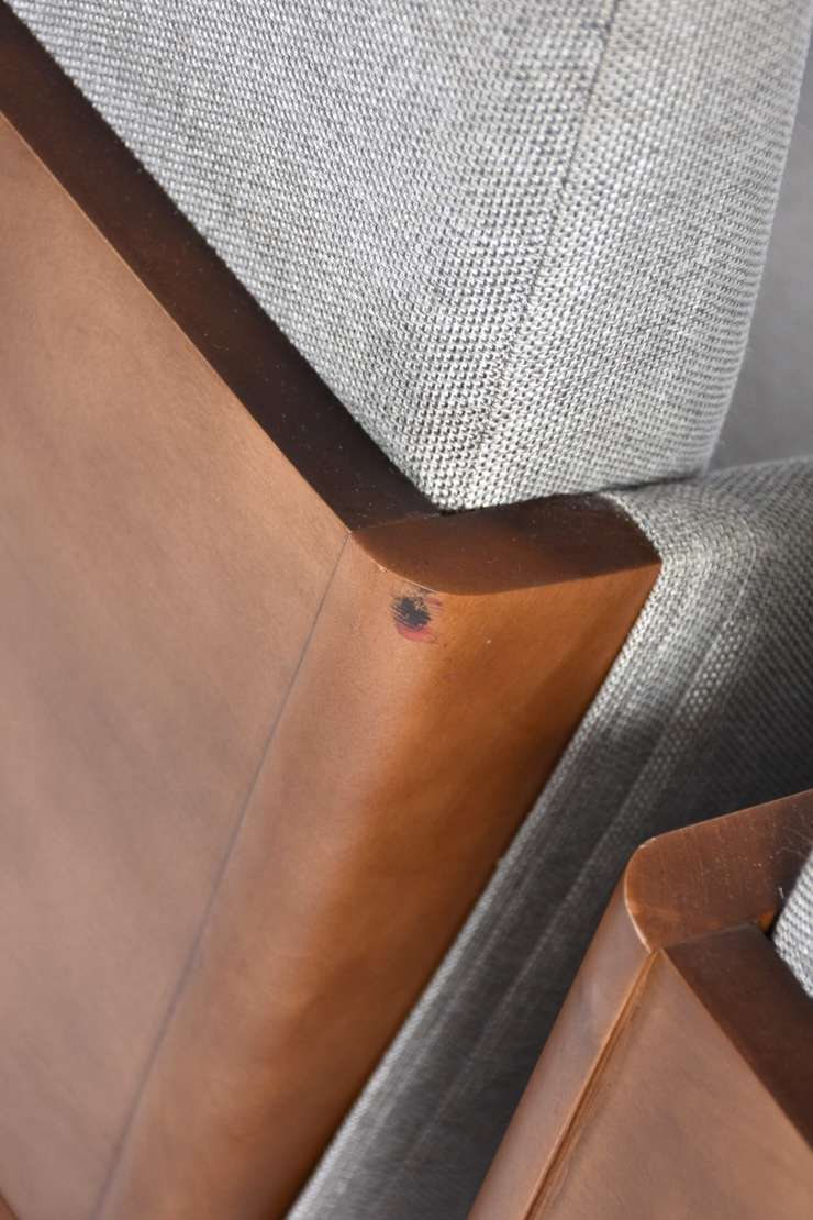Pequena poltrona na cor bege, com mancha.