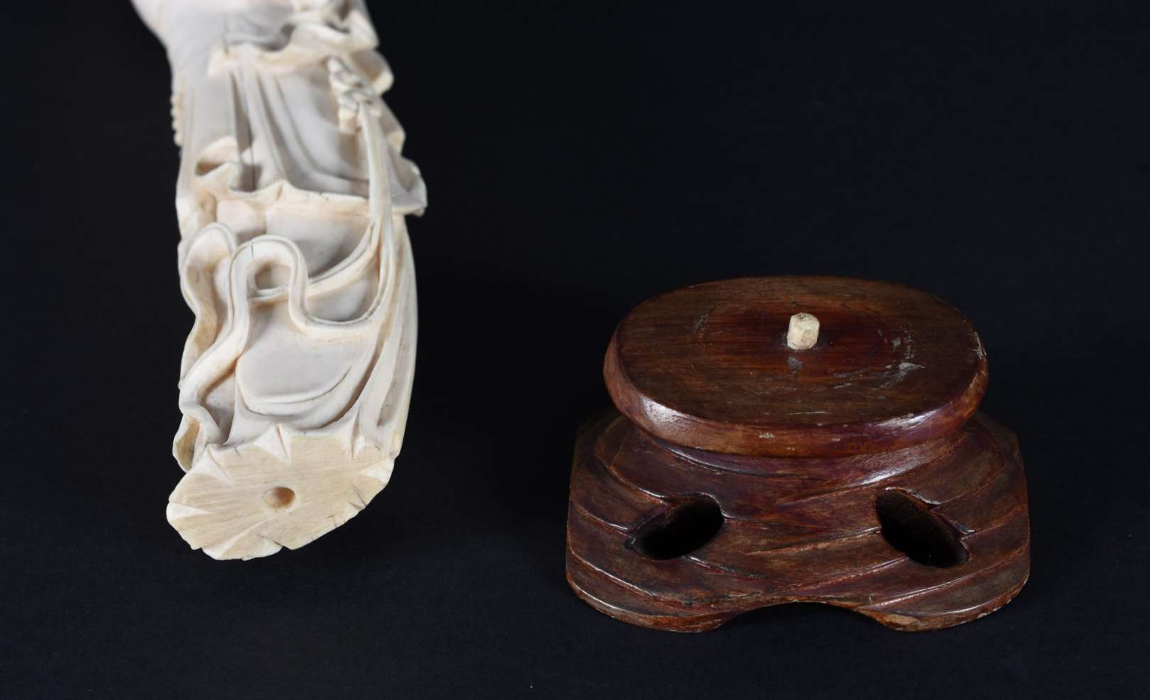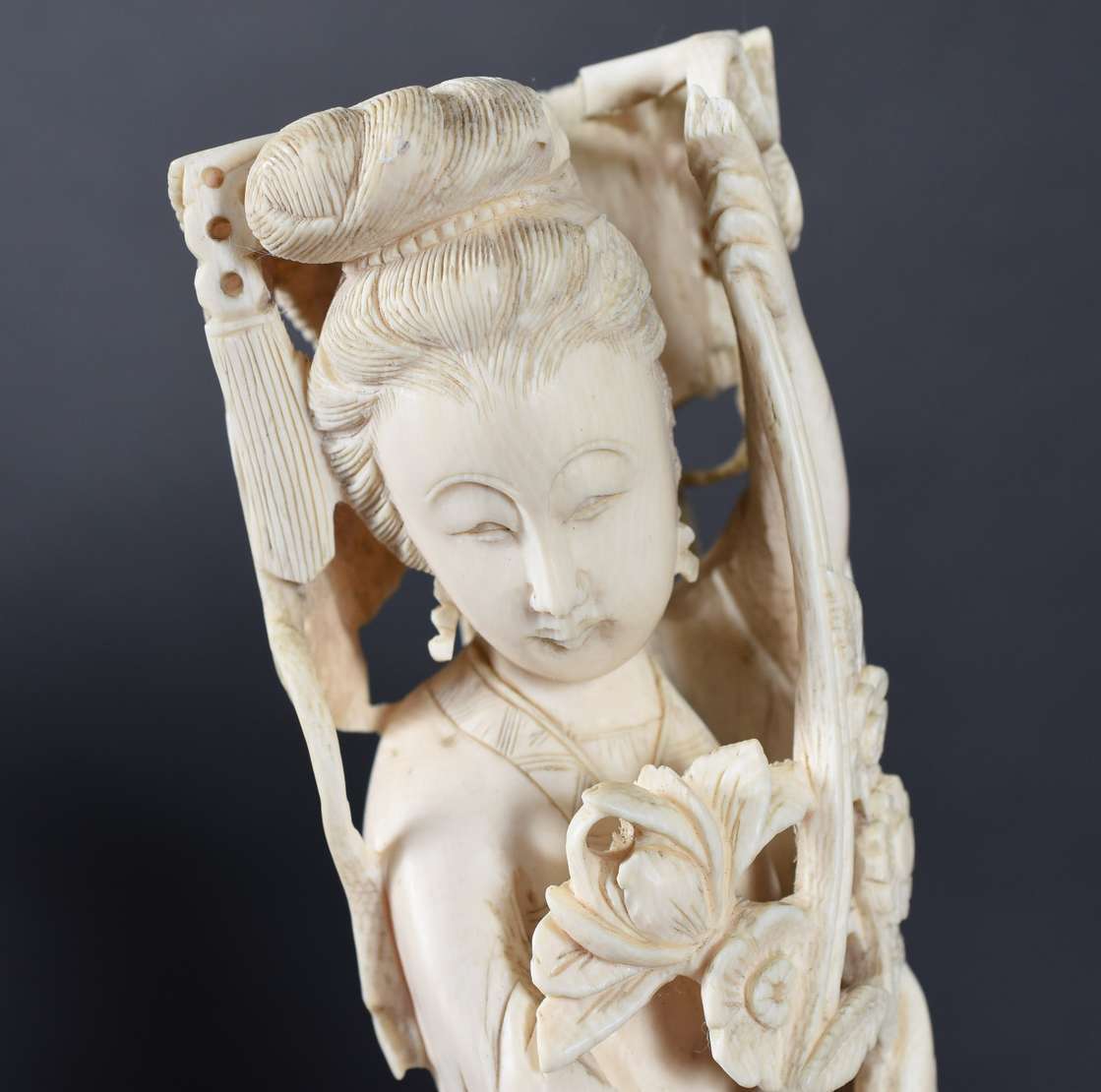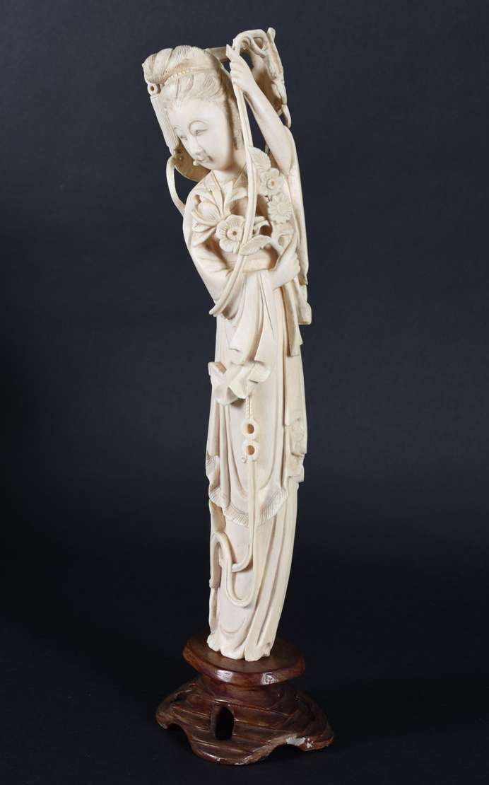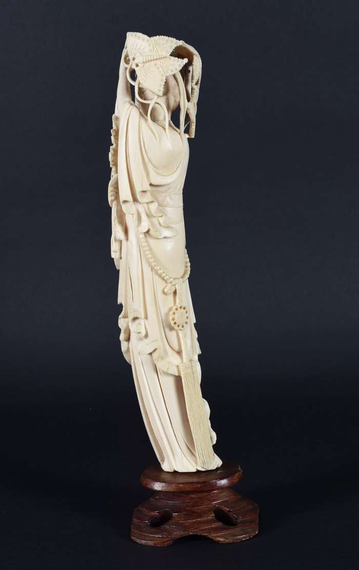 Estatueta de marfim representando Gueixa, base de madeira (pequena parte colada).