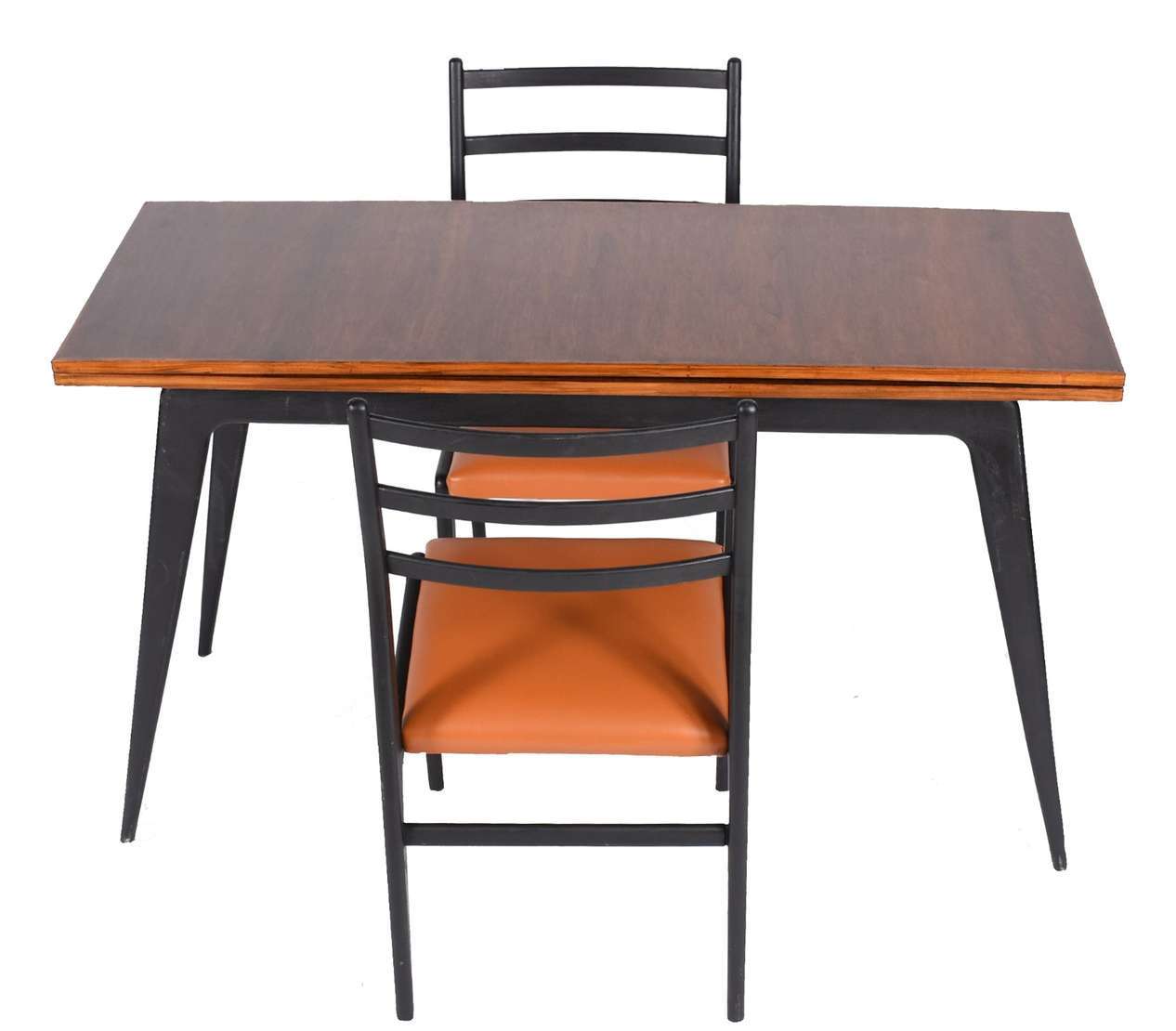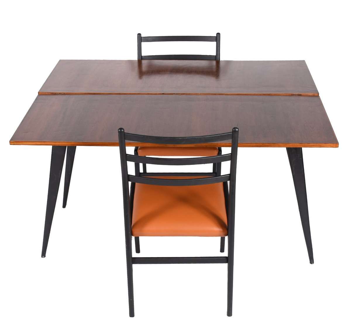 Mesa com gavetas (folheado faltando) abertura para os 2 lados; banqueta.