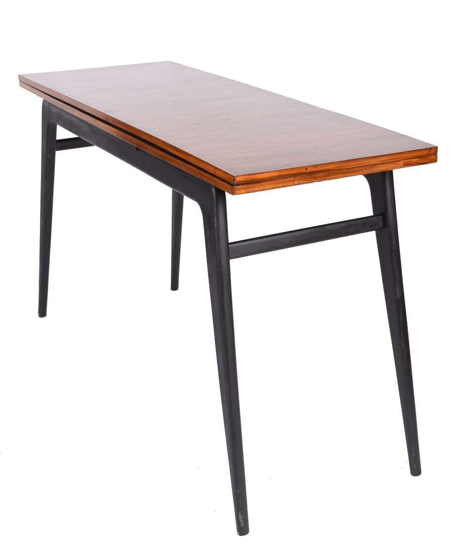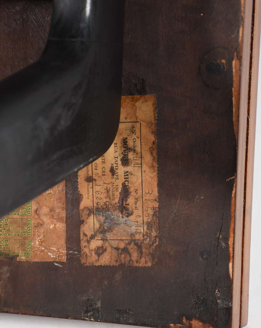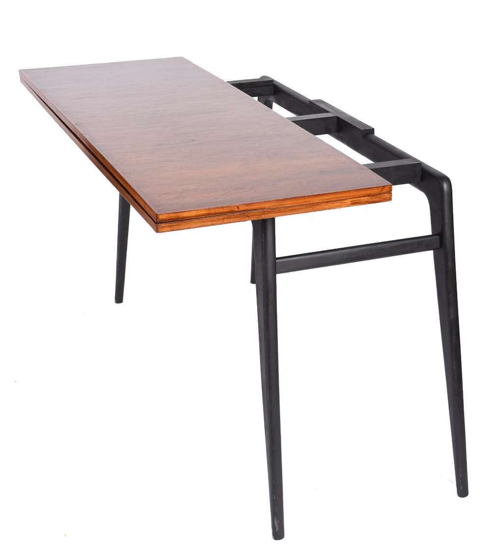 Console de madeira nobre com 4 pernas ligeiramente recurvas unidas por traves inferiores e arremate em pino torneado,...
