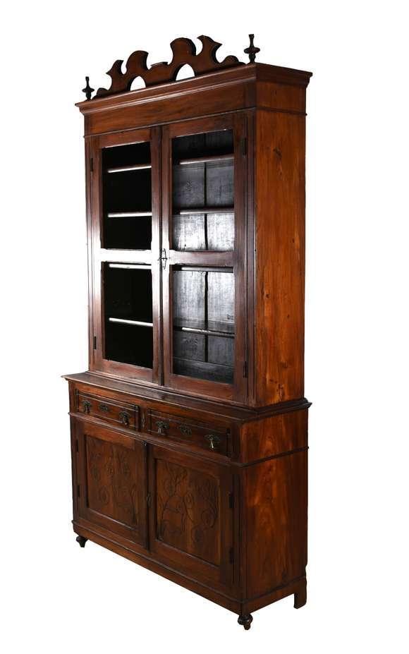 Arca com alçada de madeira nobre, parte inferior com duas portas e duas gavetas, portas superiores sem os vidros, pra...