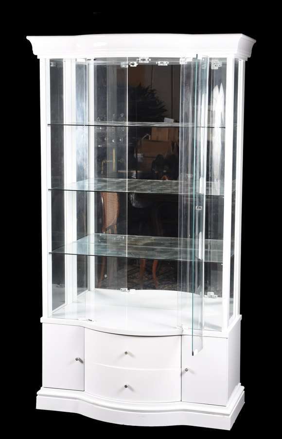 Cristaleira de madeira laqueada de branco, com fundo espelhado e prateleiras de vidro (uma com bicado).