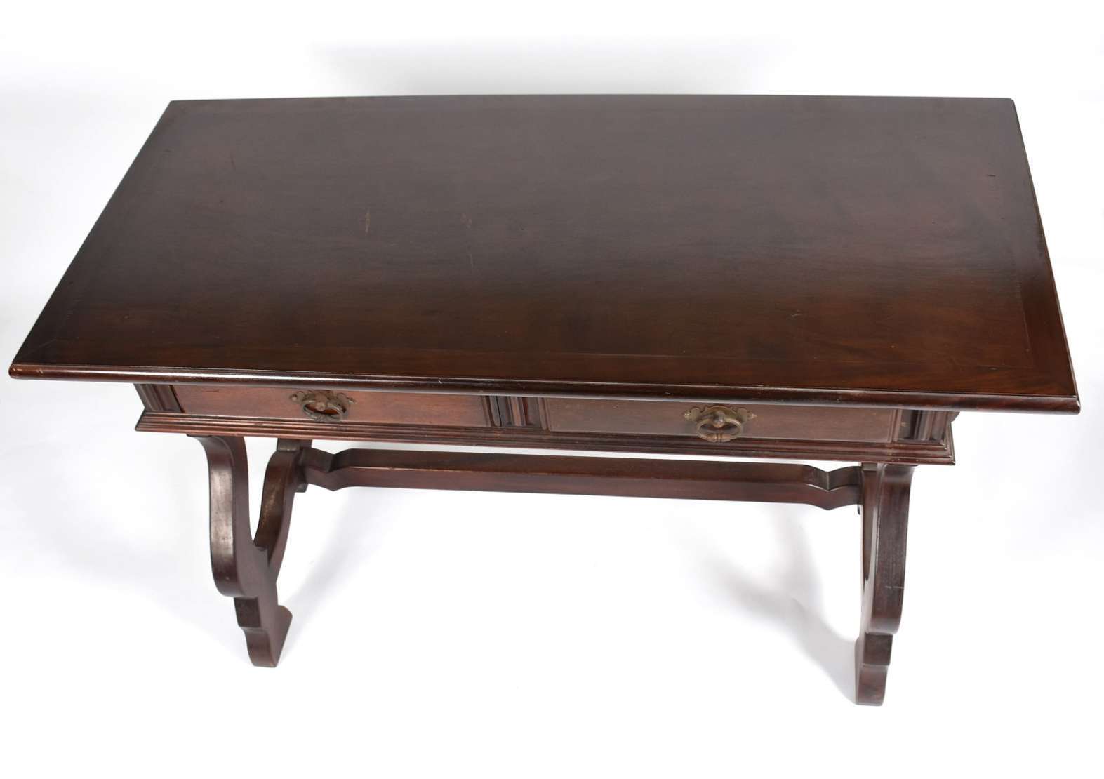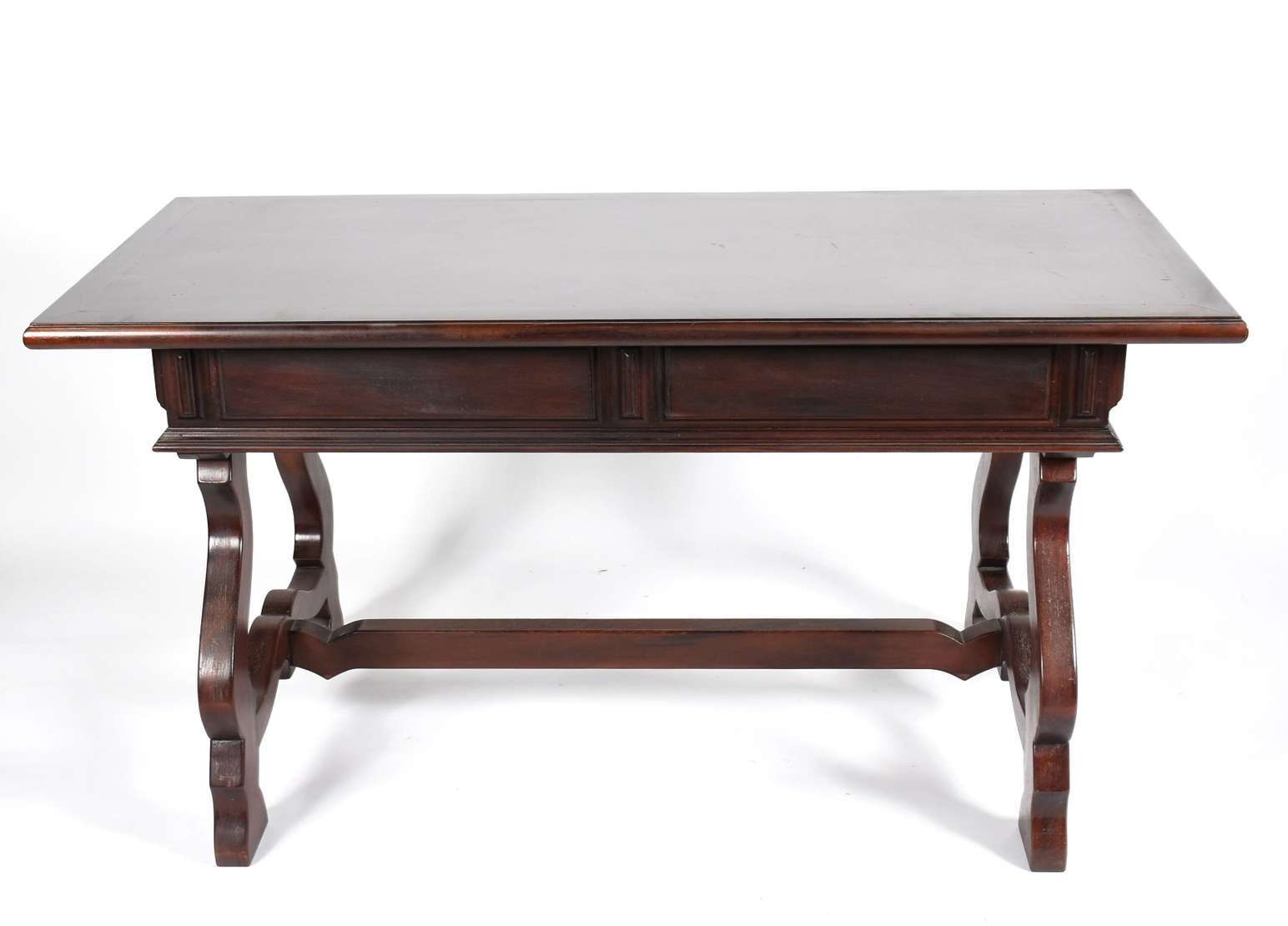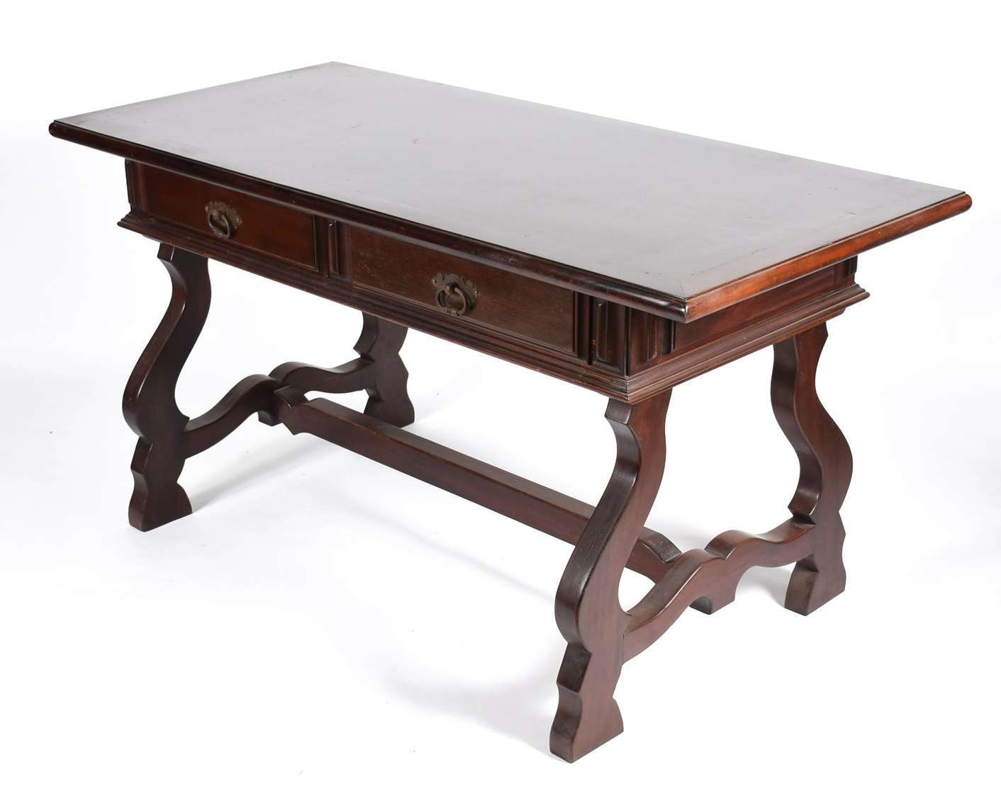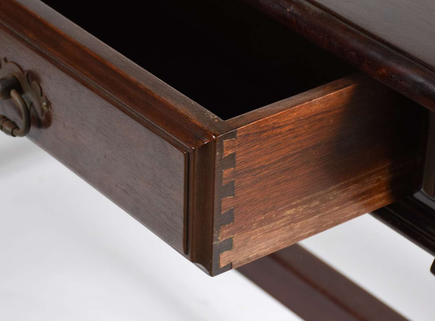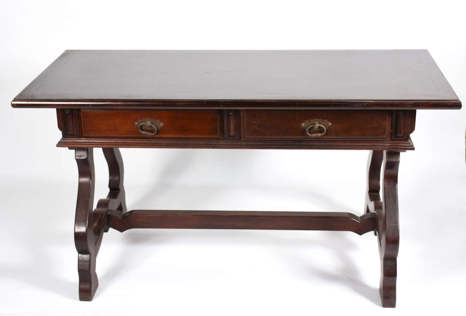 Console de madeira nobre com 4 pernas ligeiramente recurvas unidas por traves inferiores e arremate em pino torneado,...