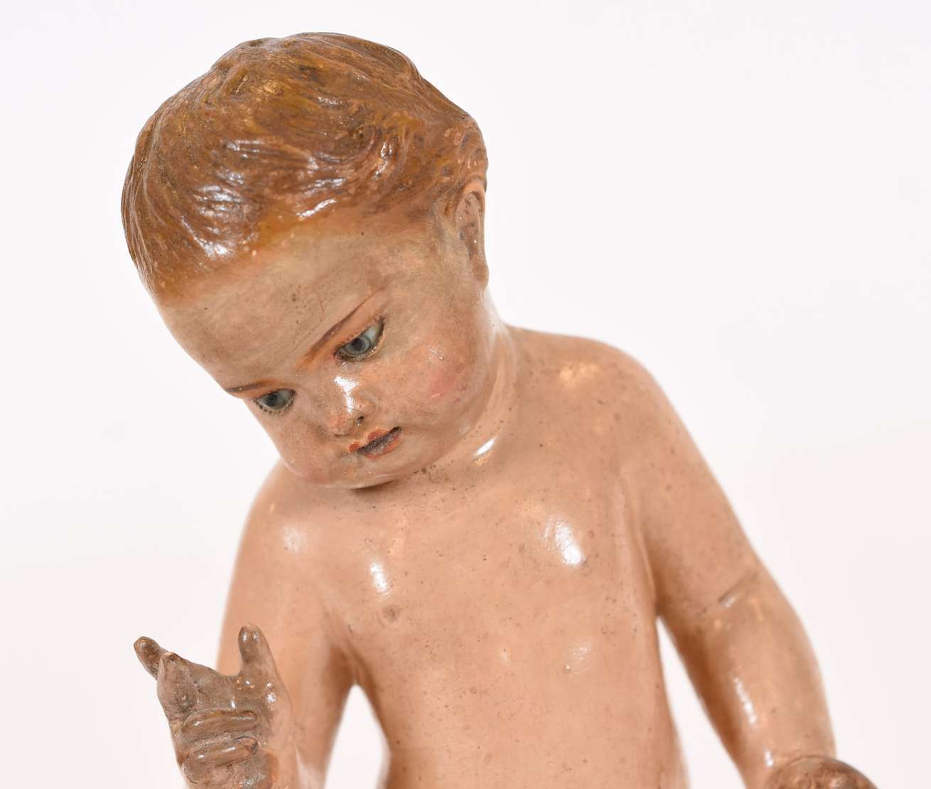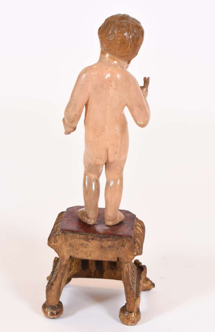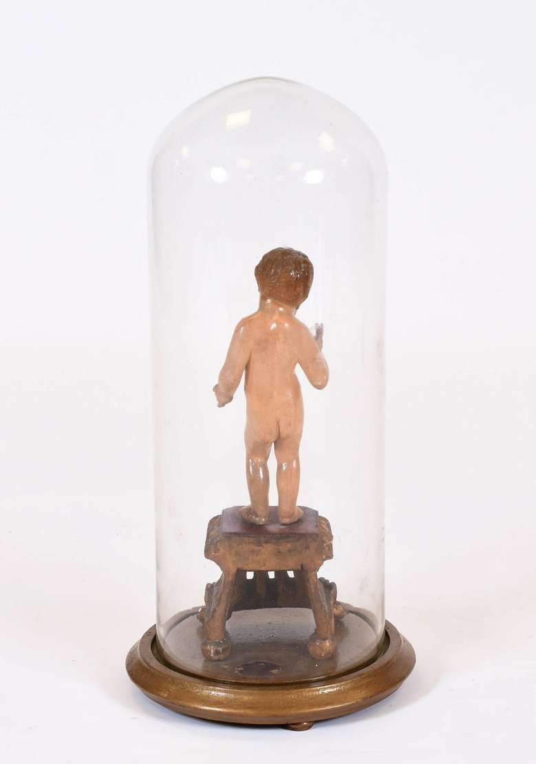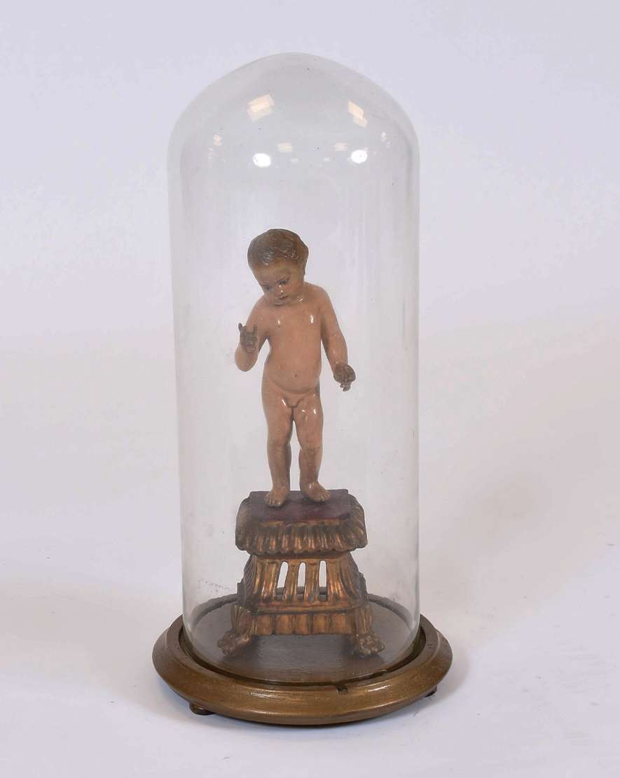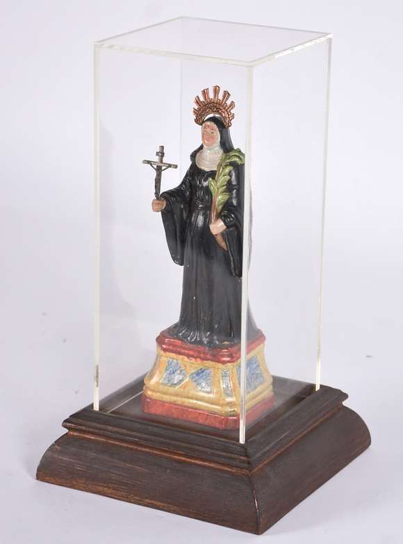 Imagem de porcelana policromada, acompanha base de madeira e "caixa" de acrílico.