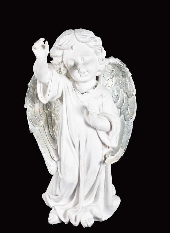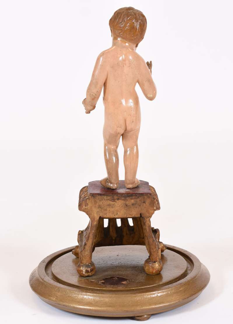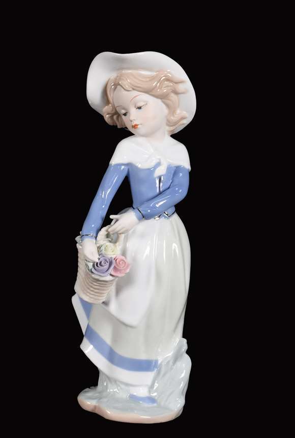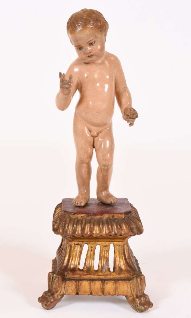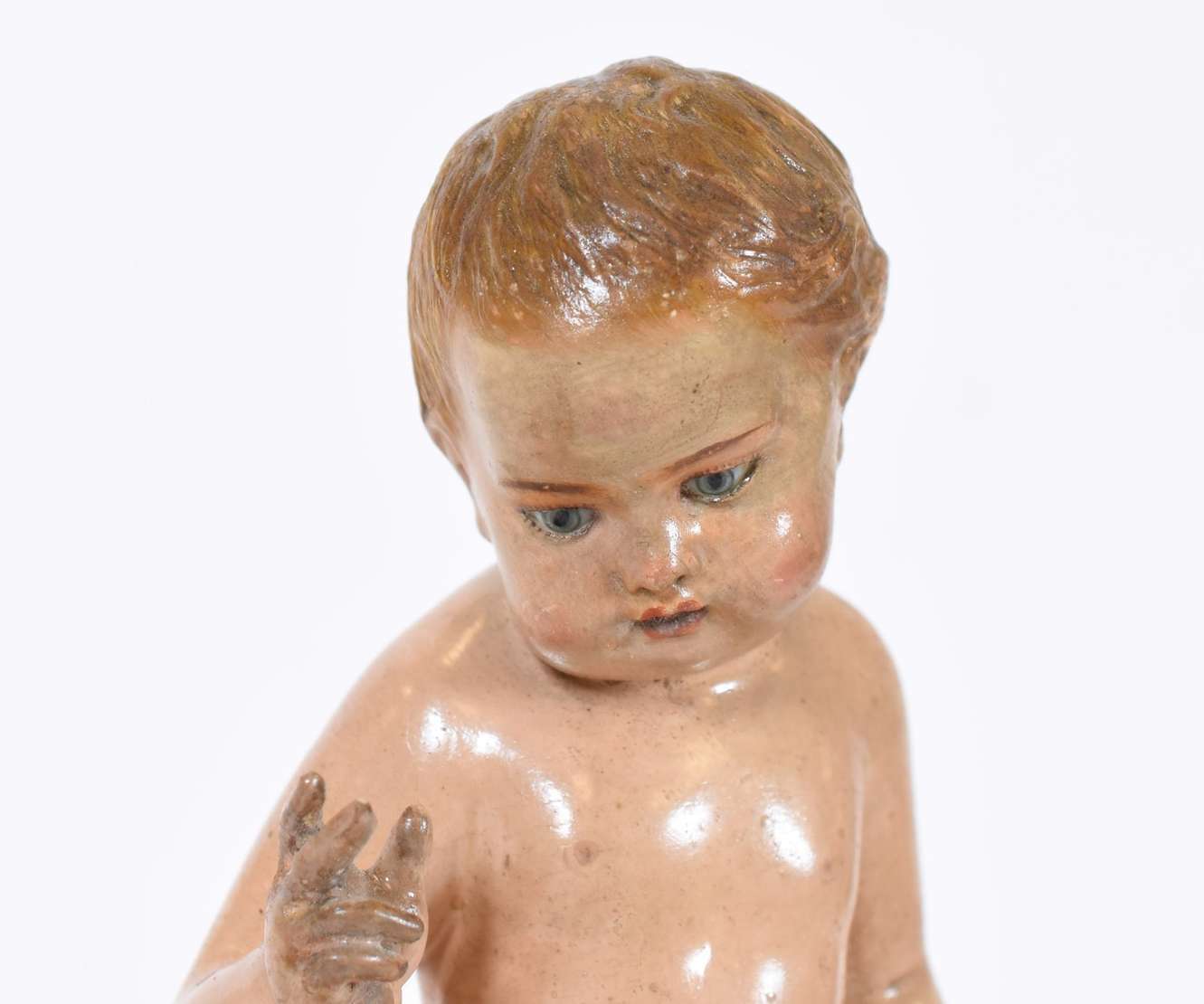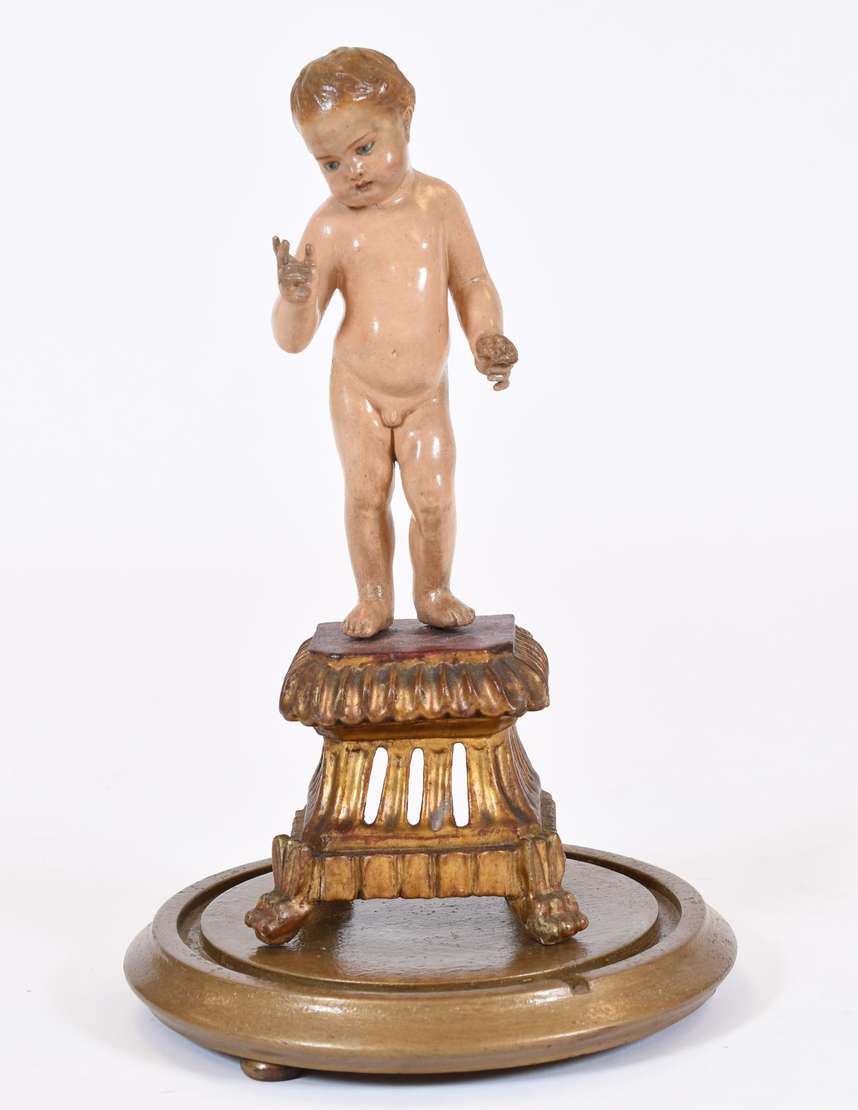Imagem de porcelana policromada, acompanha base de madeira e "caixa" de acrílico.