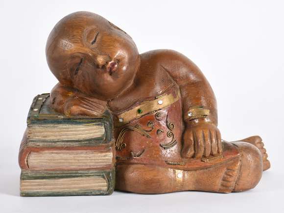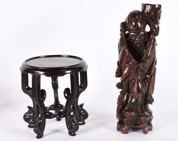 Estatueta de madeira entalhada oriental entalhada representando sábio. Acompanha base.