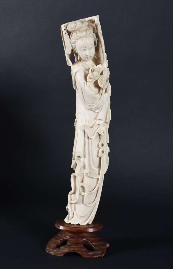 Estatueta de marfim representando Gueixa, base de madeira (pequena parte colada).