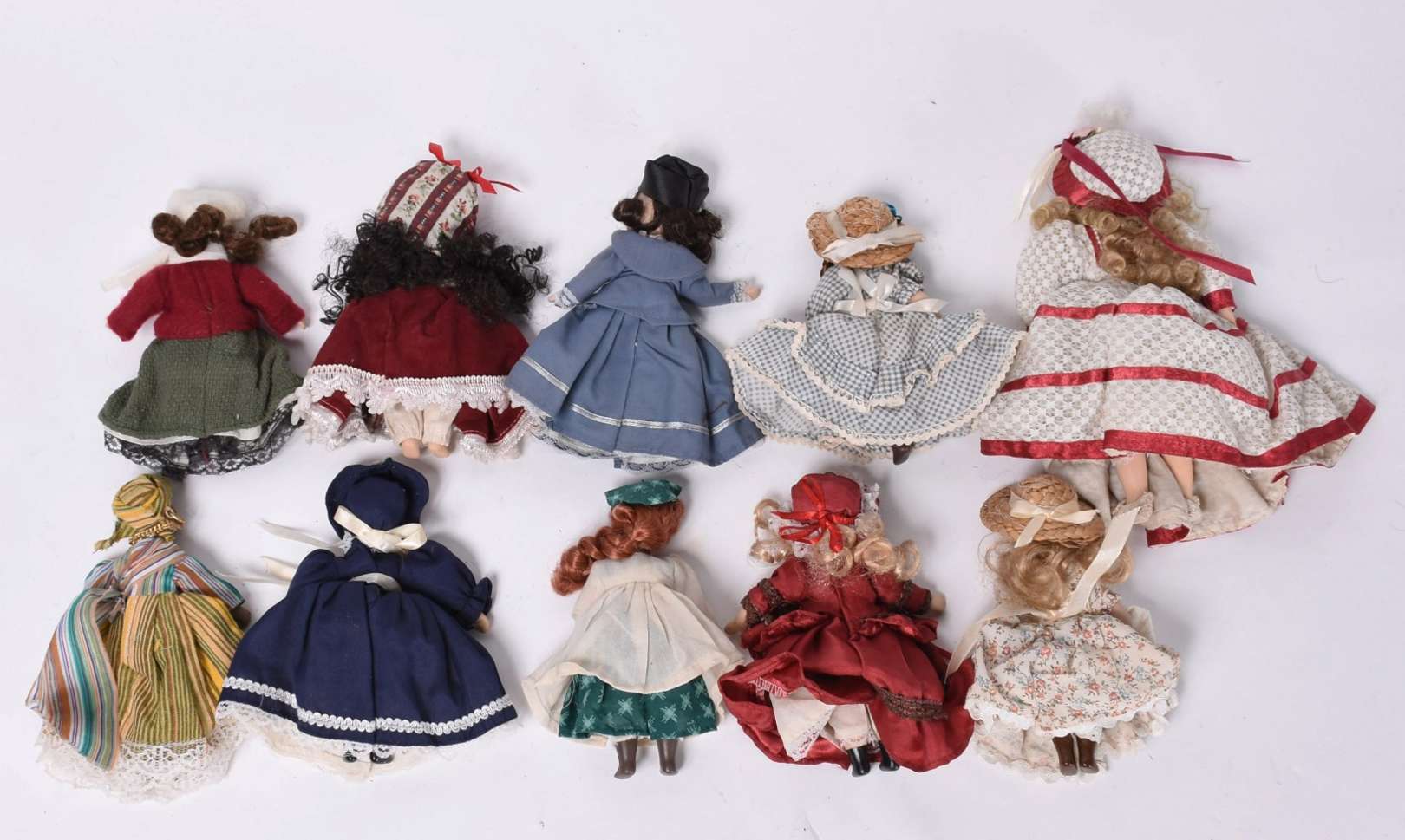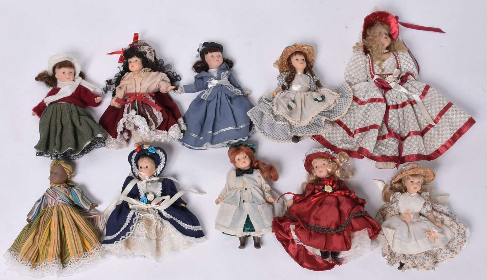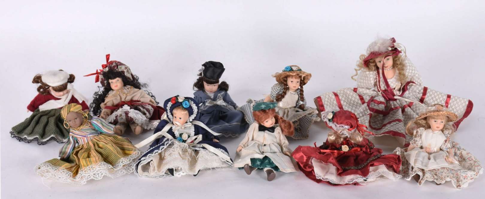 Lote arrematadoLote 523 - Ao vivo! Dez bonecas de porcelana articuladas. 15 cm