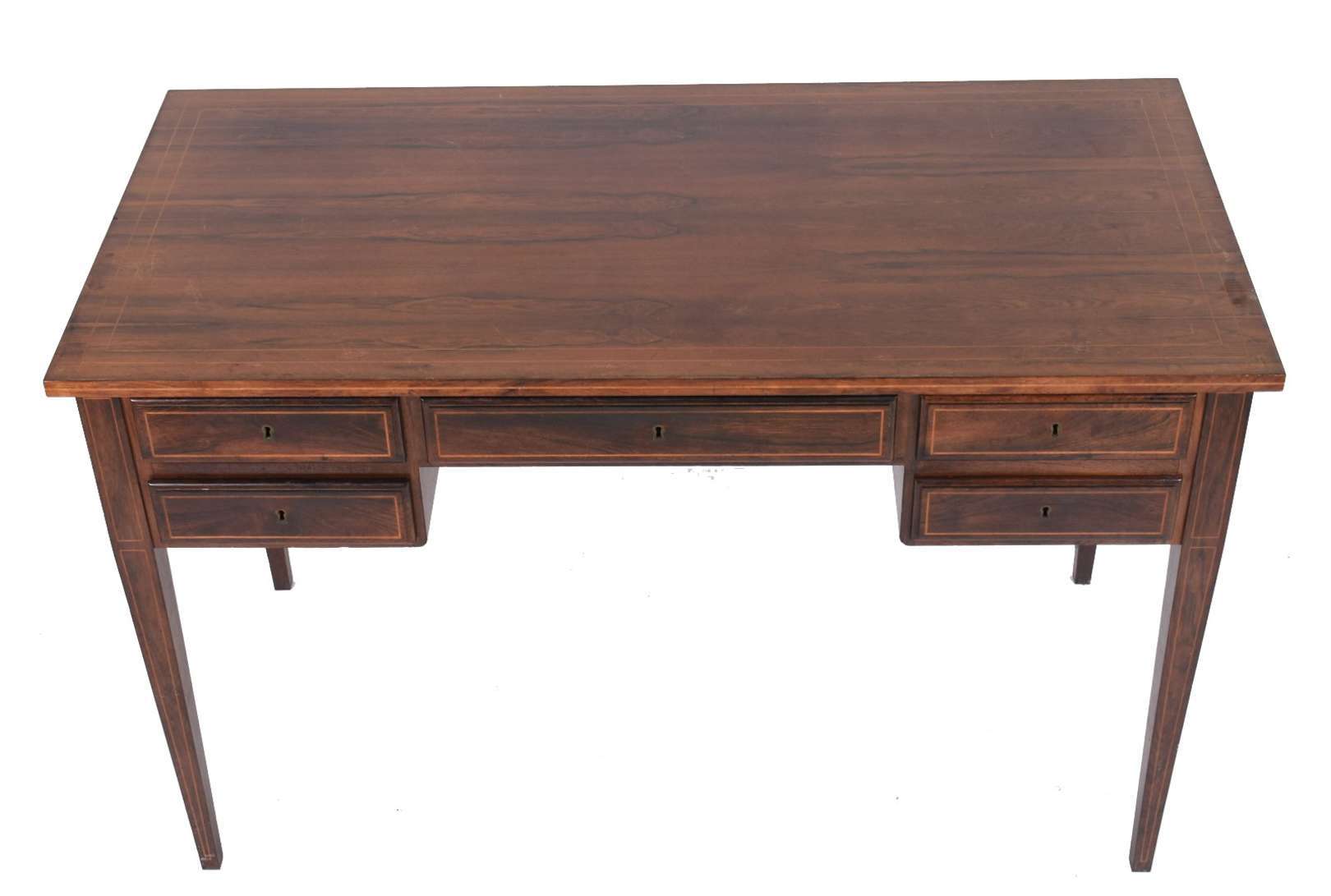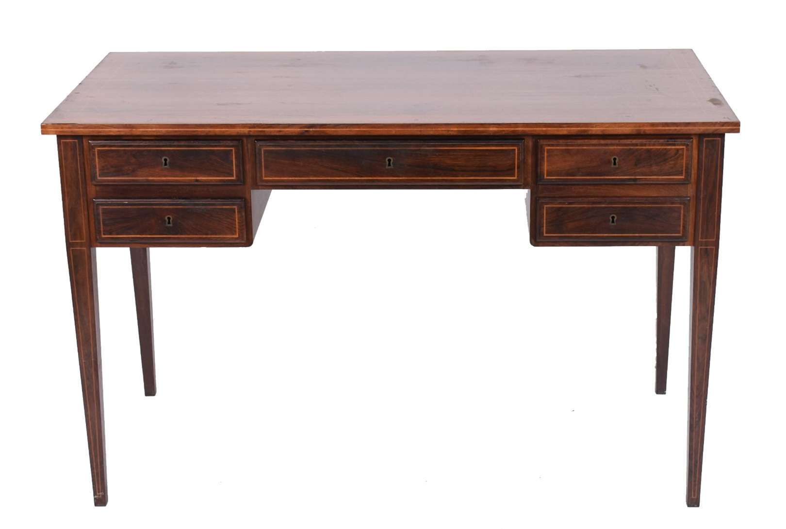 Mesa com gavetas (folheado faltando) abertura para os 2 lados; banqueta.