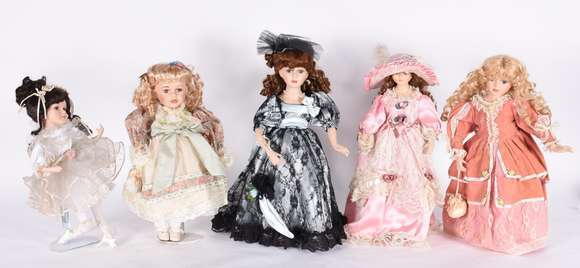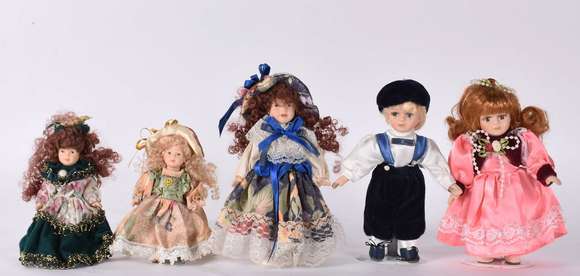 Cinco bonecas de porcelana diversas, sendo 2 de pendurar.