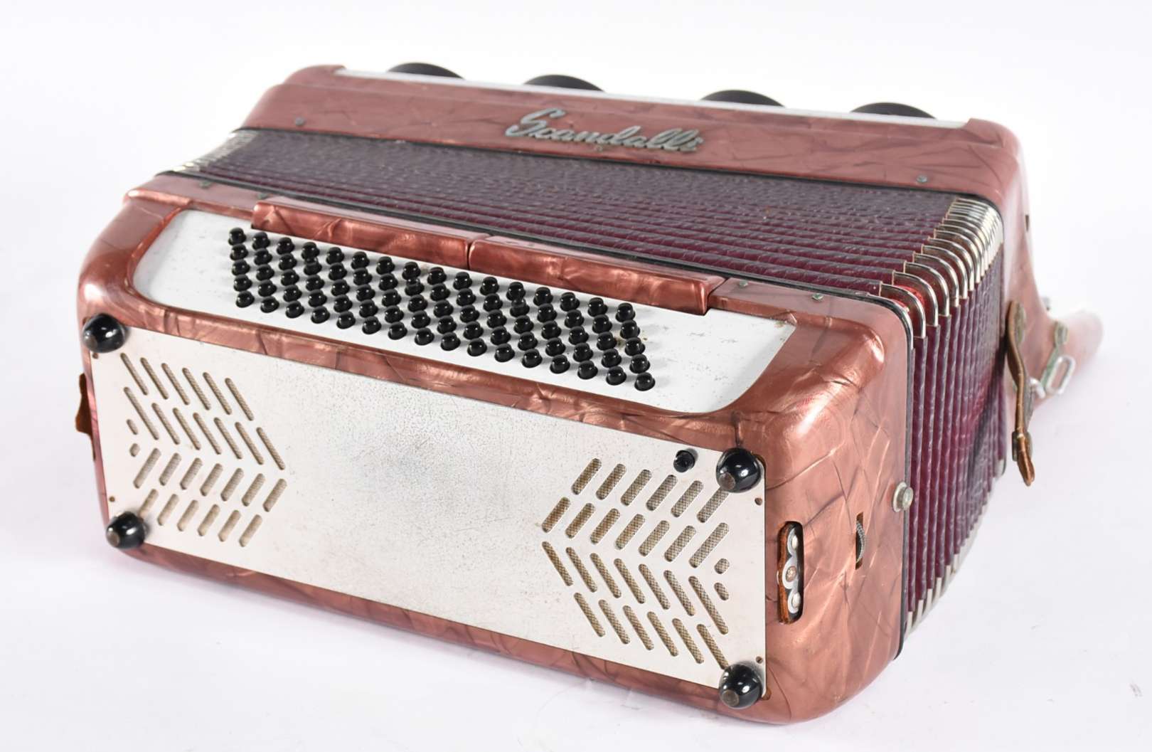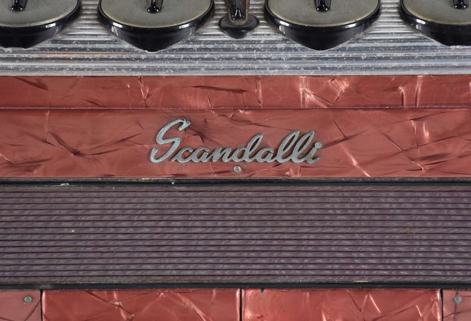 Caixa de metal prateado com figuras em relevo.