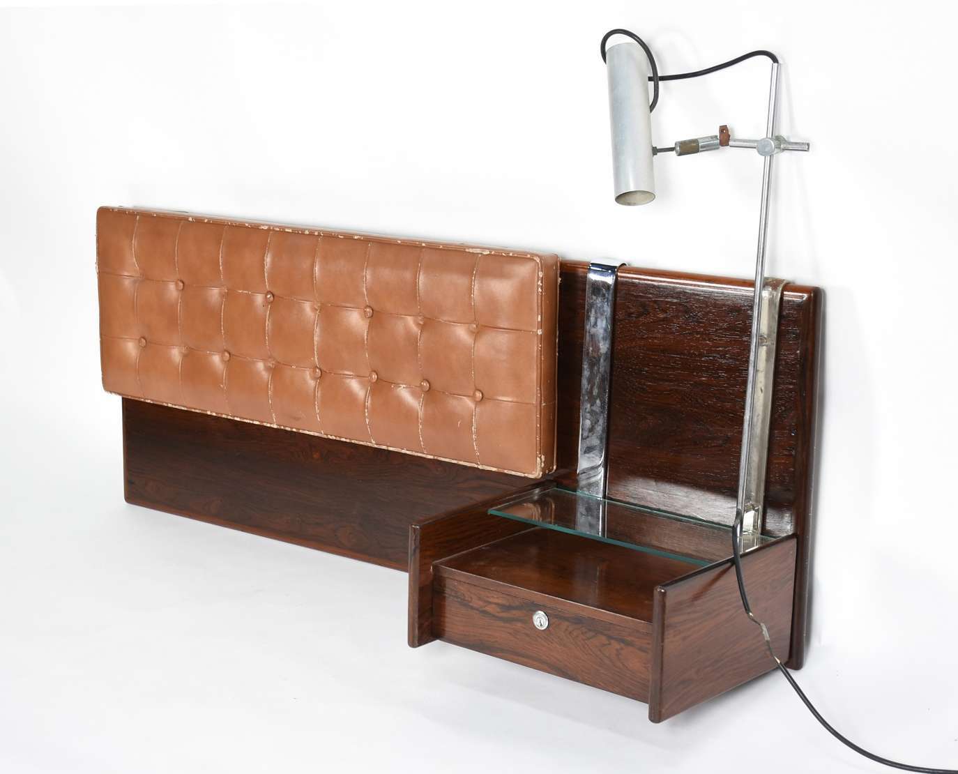 Mesa com gavetas (folheado faltando) abertura para os 2 lados; banqueta.