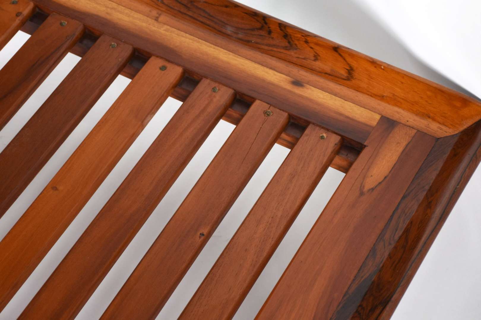 Banco de madeira com ripas, pés de metal pintados de preto.