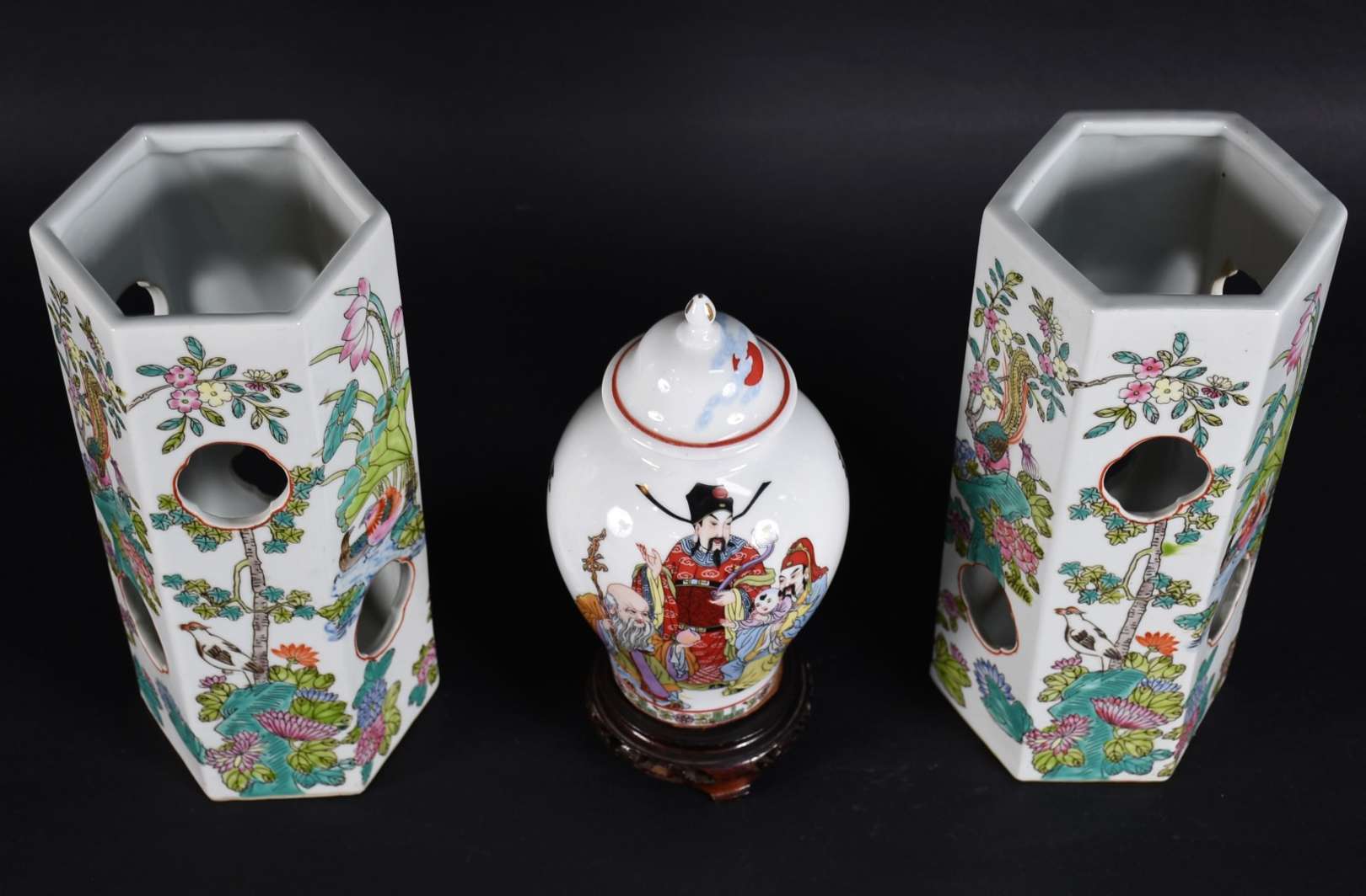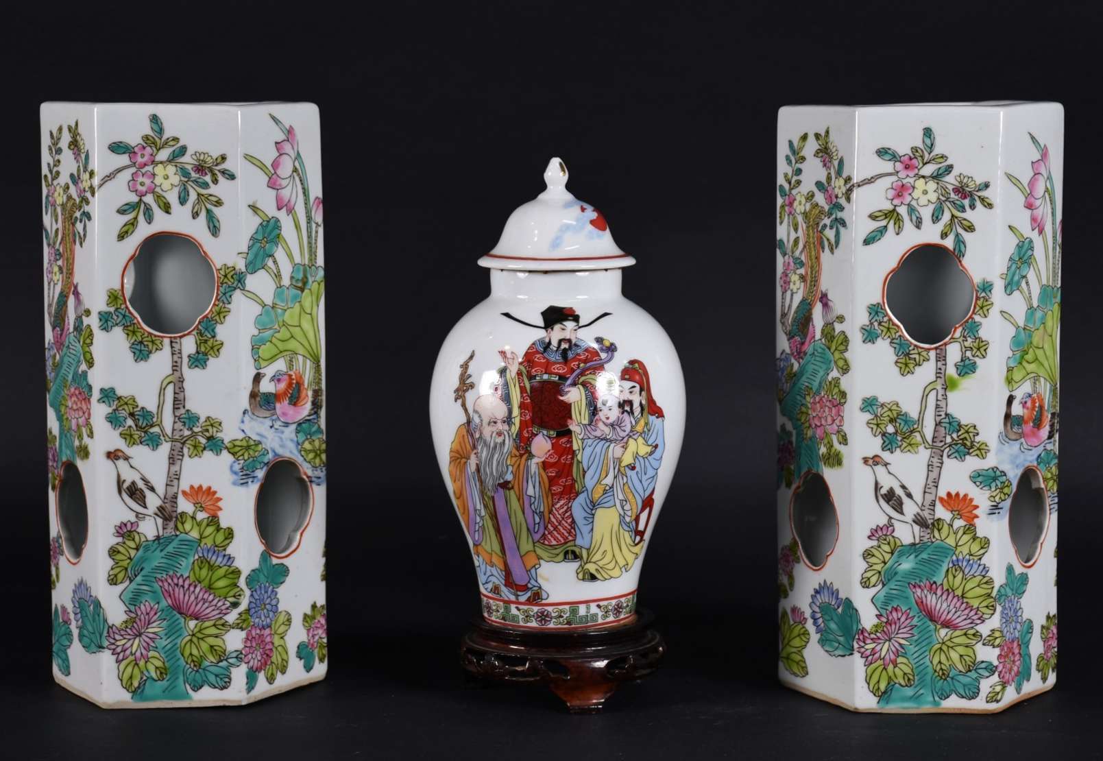Par de vasos de porcelana europeia com figuras em relevo policromado (figura feminina quebrada e colada)(podem pendur...