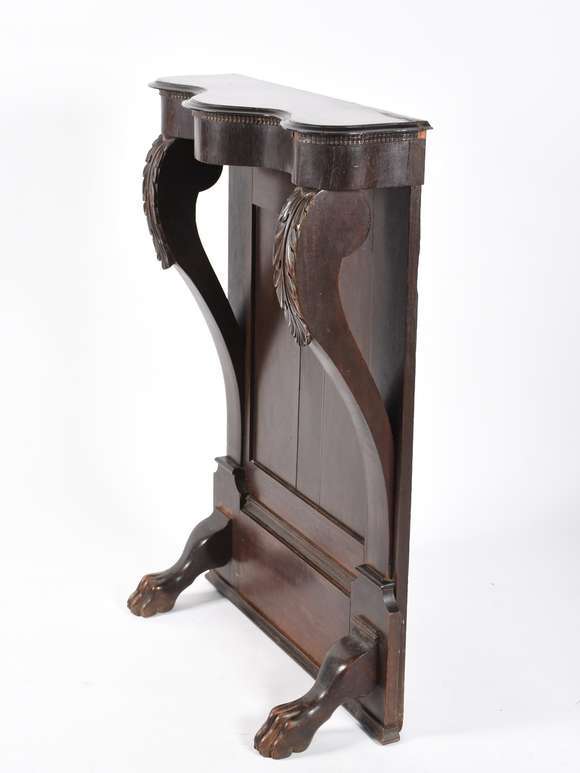 Console de madeira nobre, tampo recortado em gomos, pernas recurvas, pés de garra (tampo com pequena parte colada).