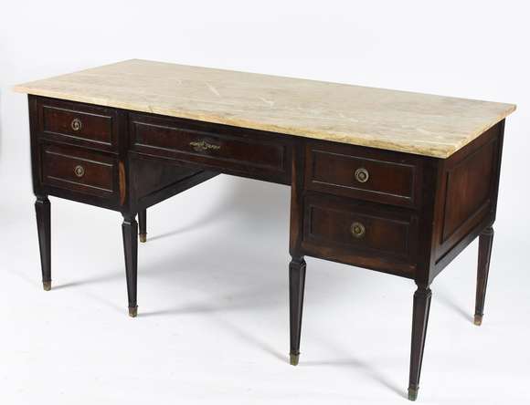 Mesa de escritório de madeira nobre com 5 gavetas e tampo de mármore.