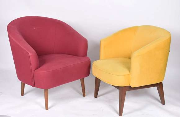 Duas poltronas estofadas, sendo uma harper com pés de madeira da loja TOK STOK e outra com estofado amarelo (modelos ...