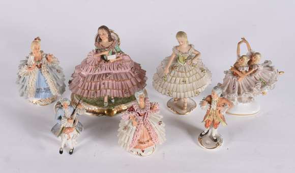 Sete estatuetas de porcelana policromada representando bailarinas (babados com alguns quebrados).