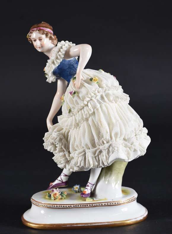Escultura de porcelana alemã policromada representando bailarina (saia com alguns babados quebrados). Marca na base.