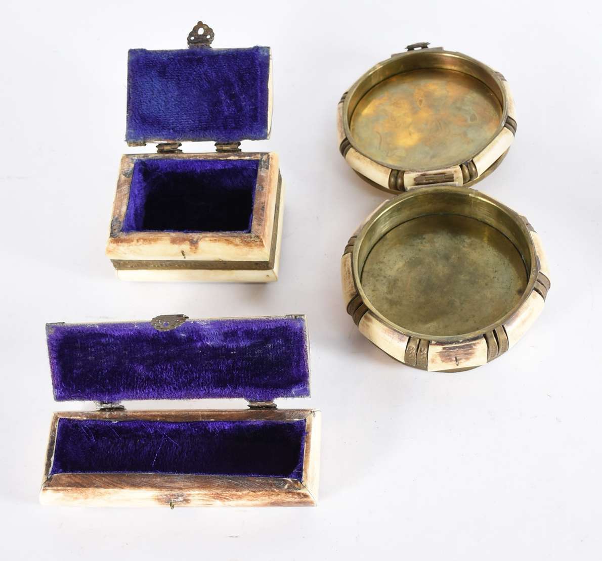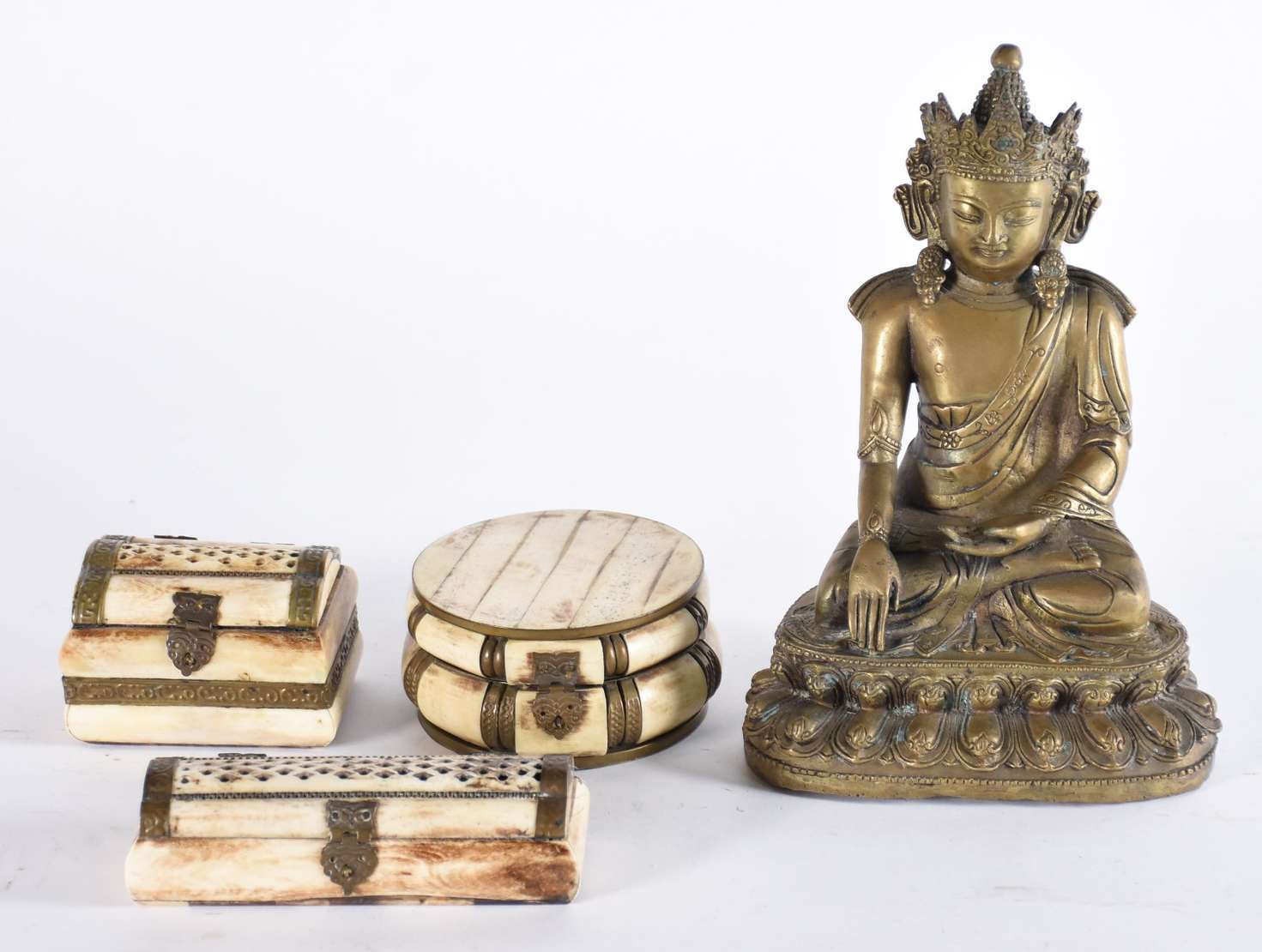 Diversas peças, sendo: 3 caixas de osso e metal e escultura de metal dourado representando Deusa Indiana. Total : 4 peças.