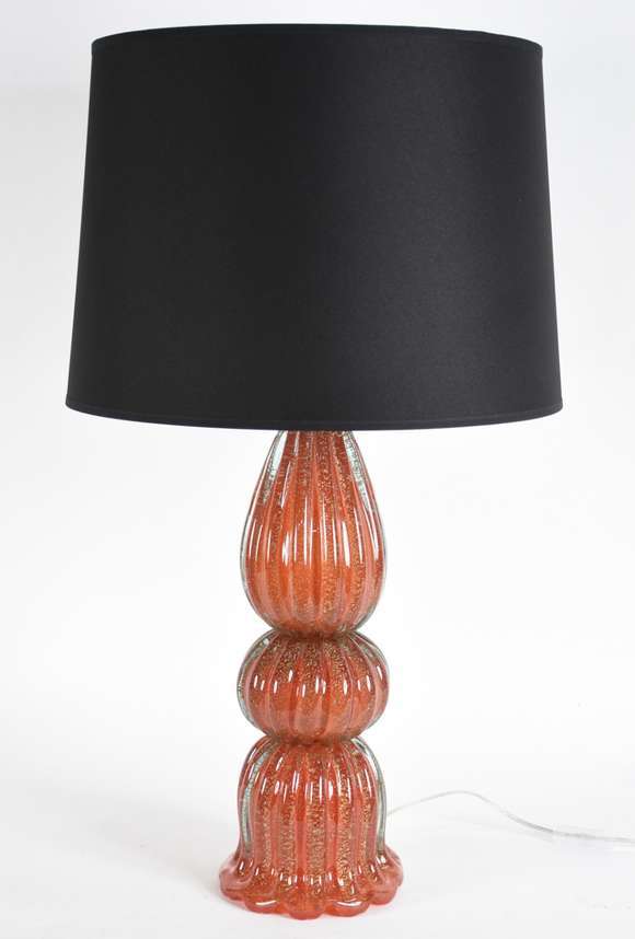 Elegante Luminária de vidro decorativo na cor laranja com purina dourada, corpo trabalhado na forma de gomos, acompan...