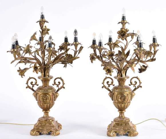 Par de belíssimas girandoles de bronze para 7 luzes cada, bases na forma de ânforas ricamente decoradas em relevo.