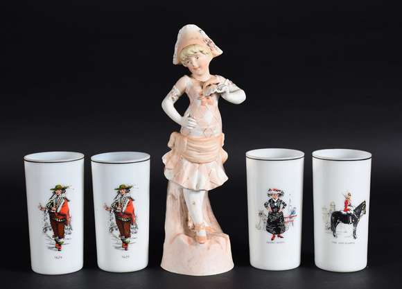 Cinco peças diversas, sendo: estatueta de biscuit policromado representando camponesa e cinco copos longos de opalina...