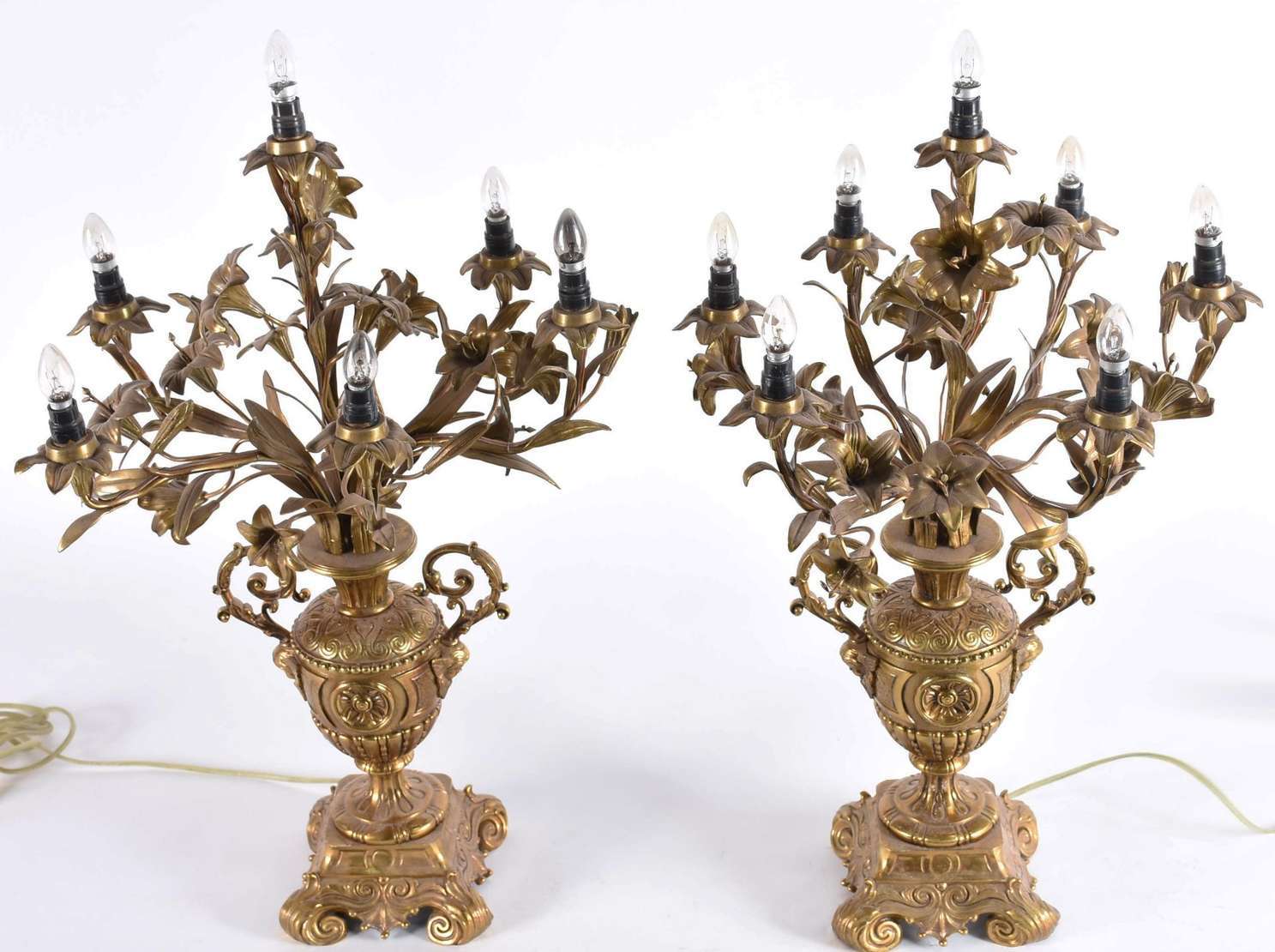Par de girandoles de cristal para 5 luzes, pingentes lapidados (faltando uma serpentina de vidro e arame dos pingente...