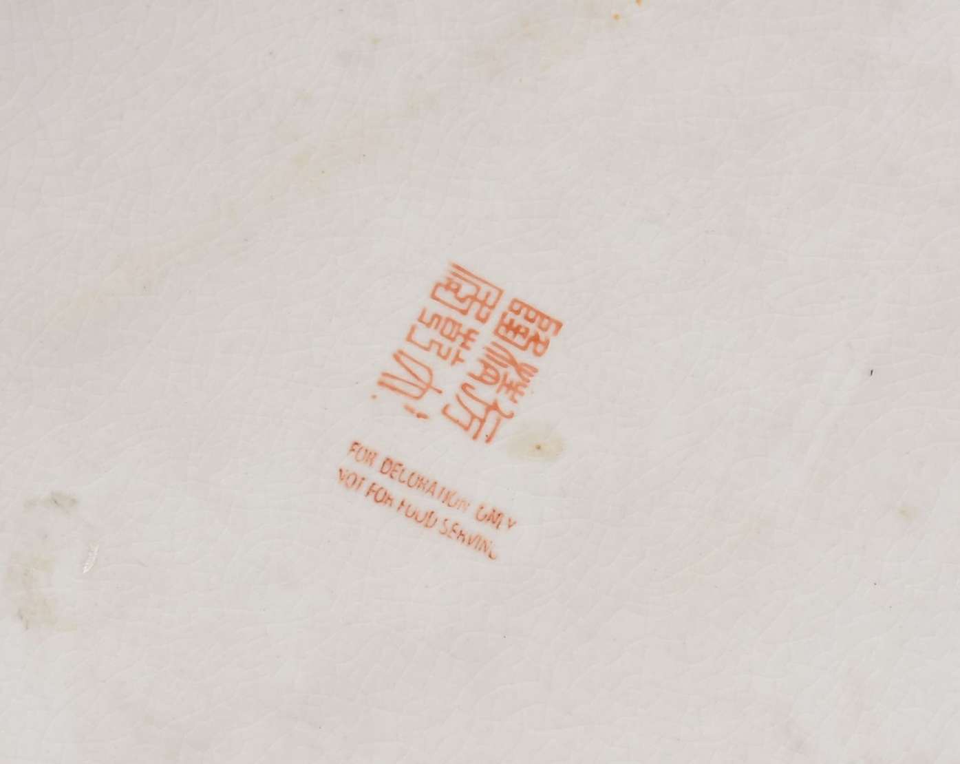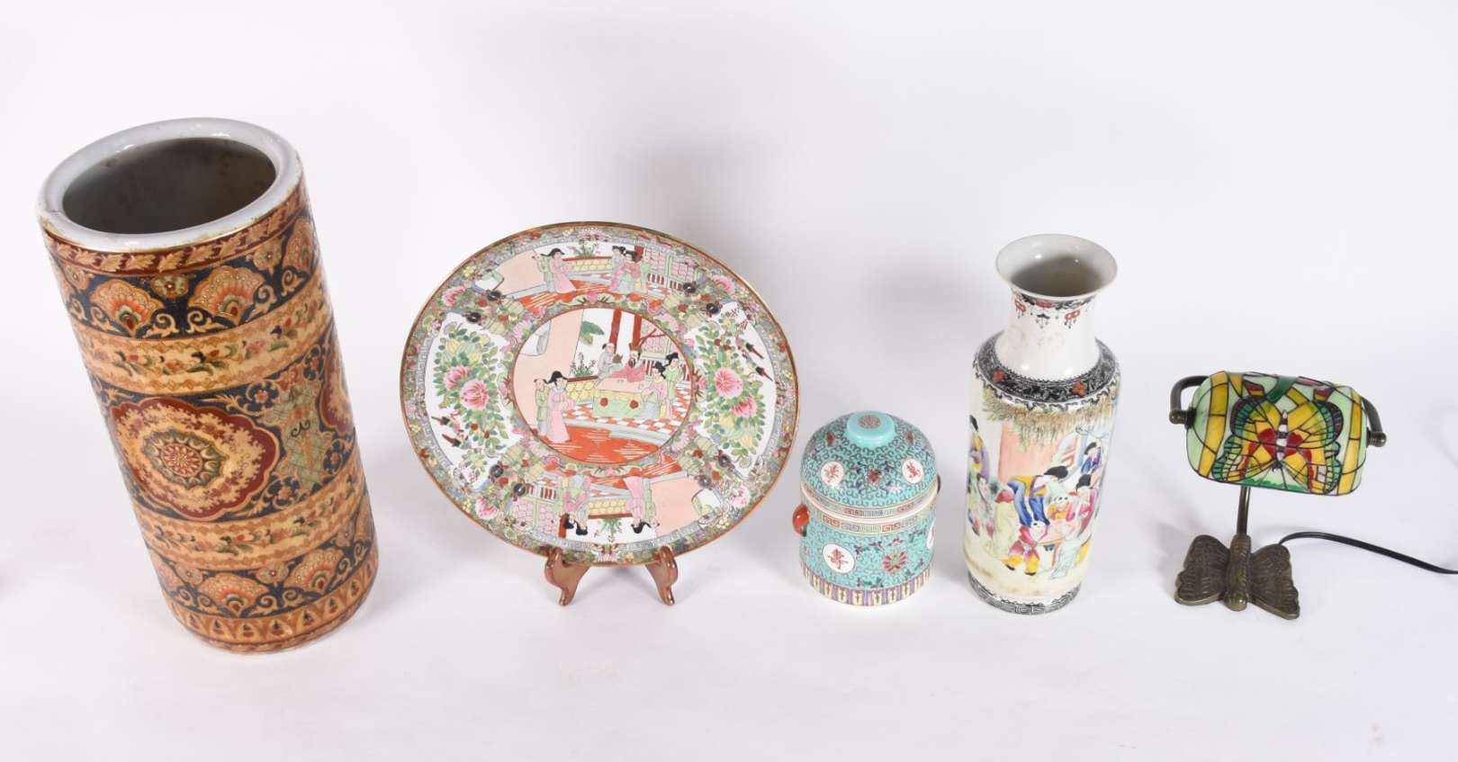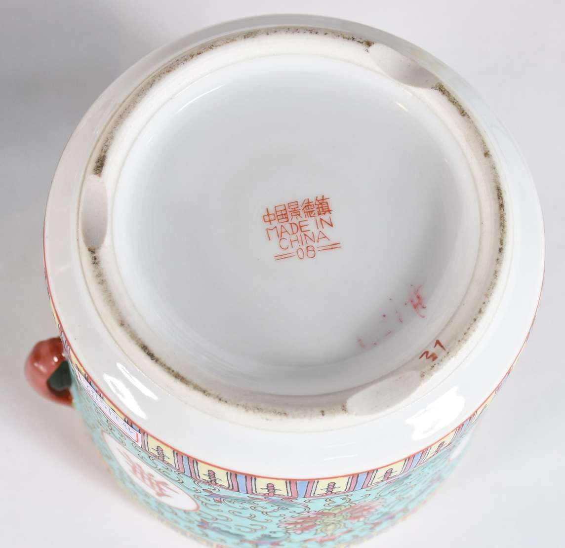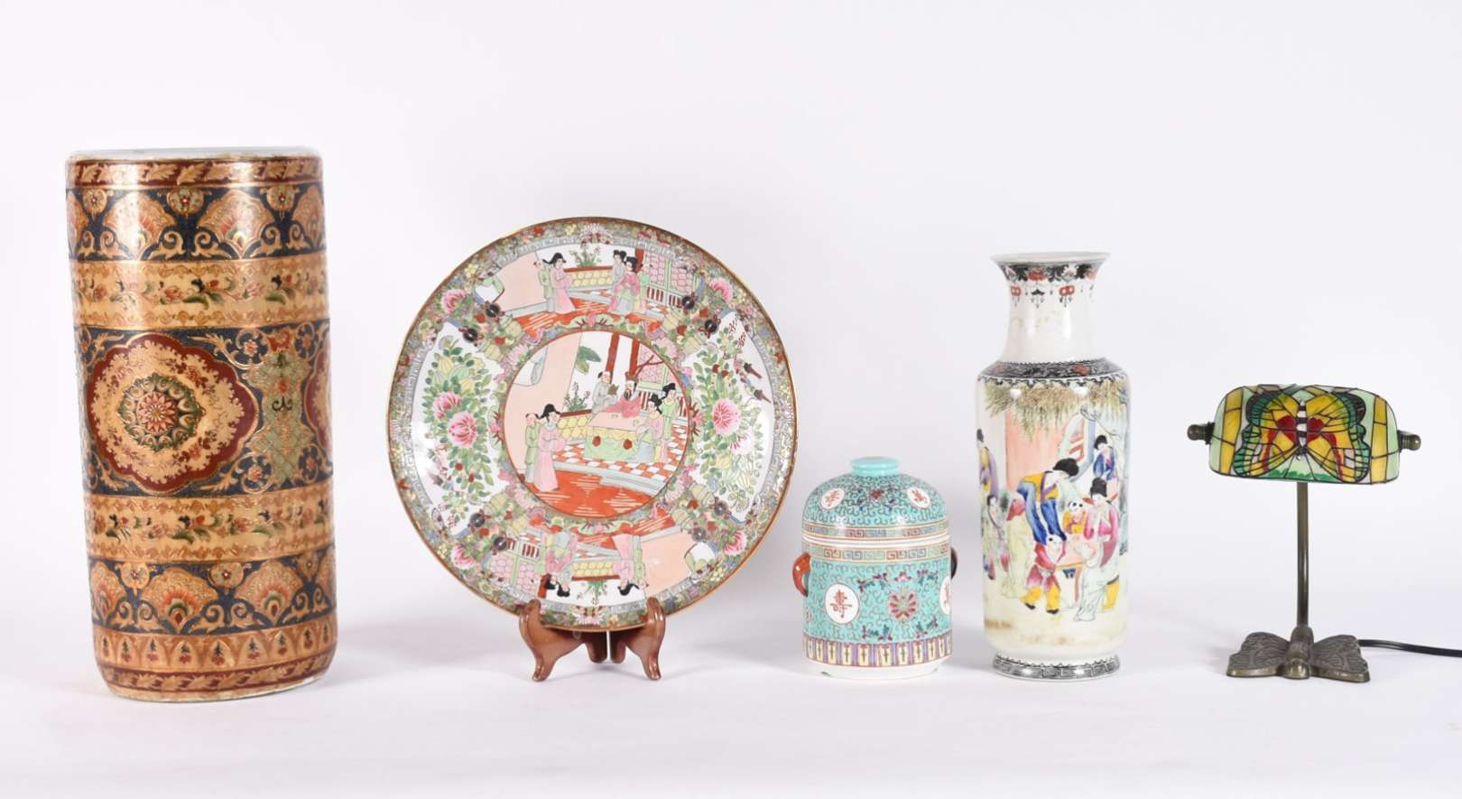 Antigo cachepot feitio sextavado de porcelana oriental ricamente decorada com gueixas e flores policromadas. (tinta f...