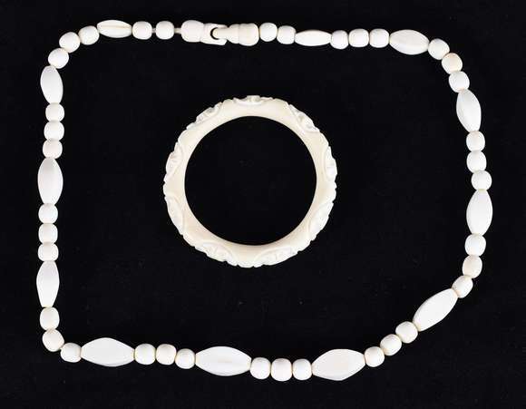 Conjunto de marfim composto de: gargantilha africana, pulseira e algema desenhada. Total 3 peças