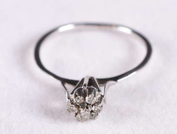 Anel de ouro branco feitio chuveiro com 7 brilhantes, aro 14 (Por motivos de segurança a peça não se encontra na loja).