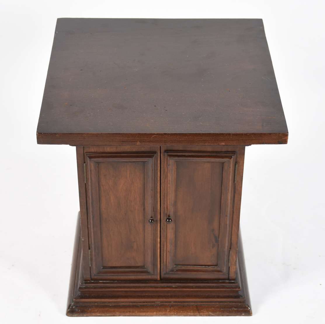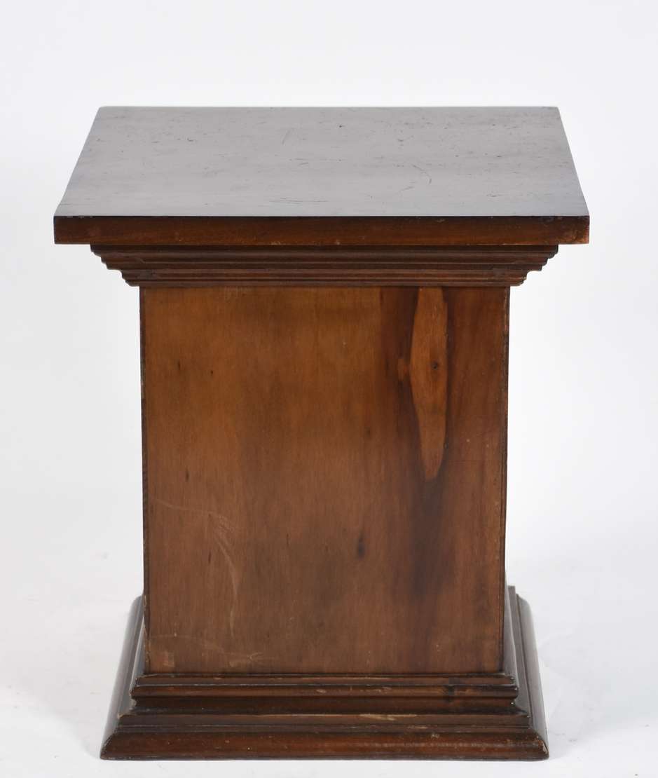 Mesa dita "Cake Table" de madeira nobre com 2 platôs ligados por coluna central torneada, base em tripé.