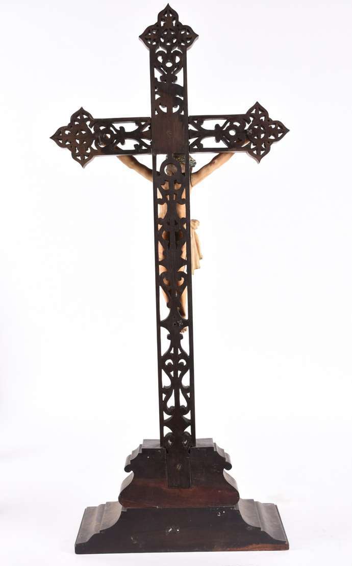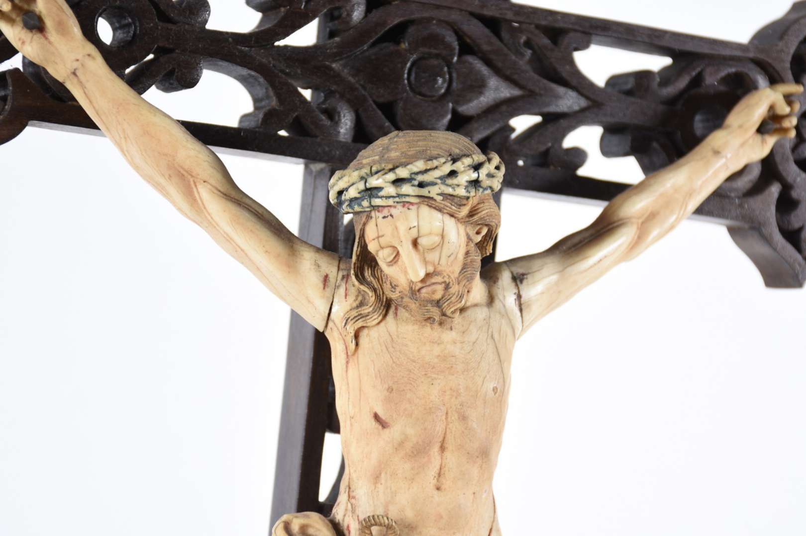 Excepcional figura de Cristo ricamente esculpida em marfim sobre crucifixo de madeira trabalhada. Século XIX.