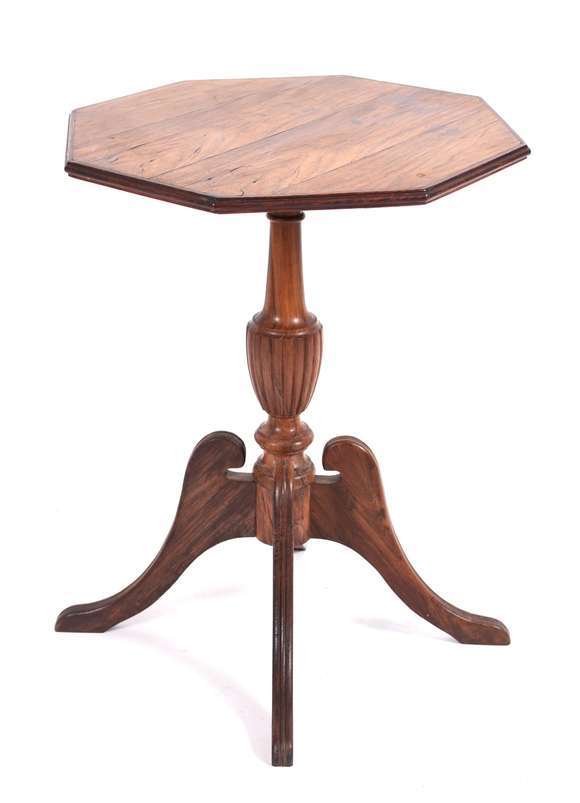 Mesinha auxiliar de madeira nobre feitio oitavado, apoio em coluna central terminando em quatro pernas recurvas.