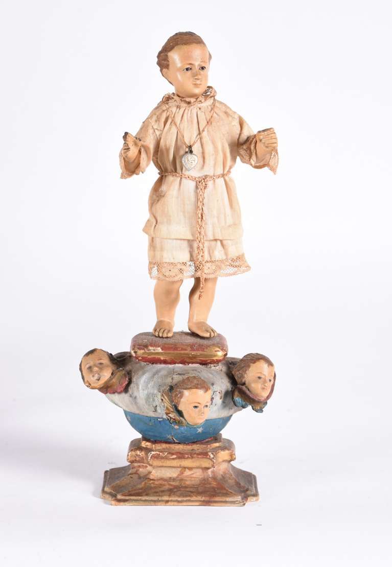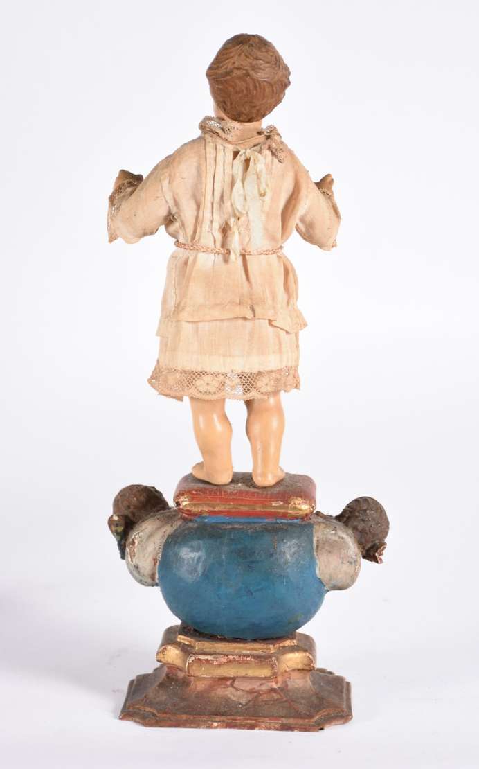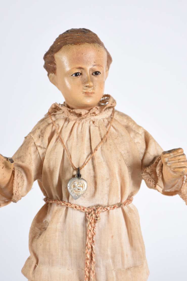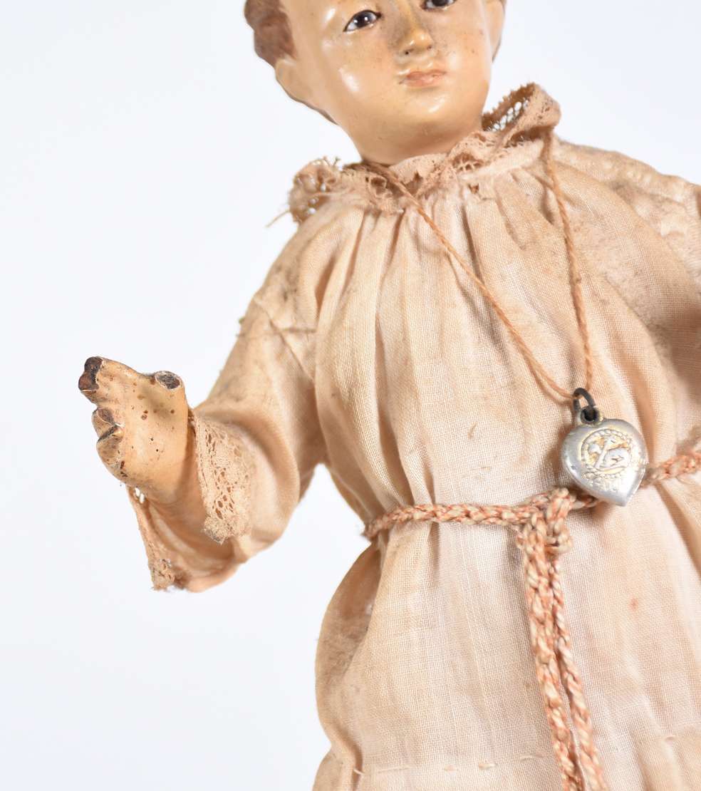 Menino Deus - Linda Imagem de madeira policromada com vestimenta de tecido. Desgastes do tempo. Século XIX.