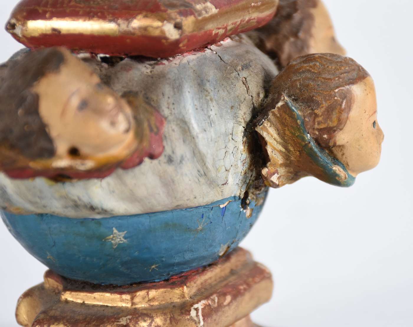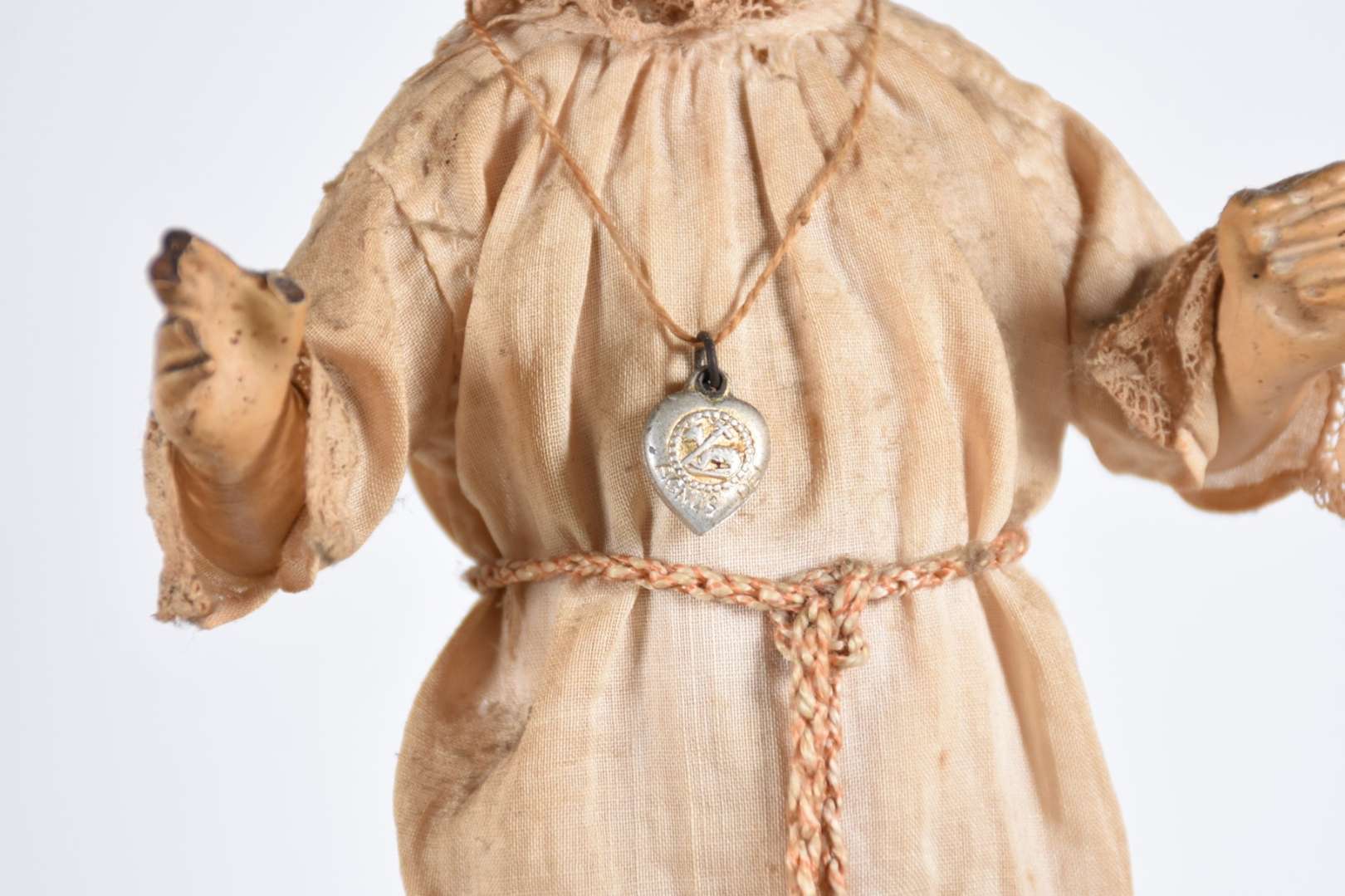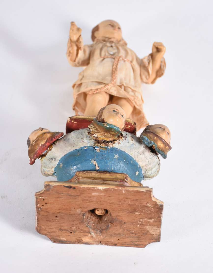 Menino Deus - Linda Imagem de madeira policromada com vestimenta de tecido. Desgastes do tempo. Século XIX.