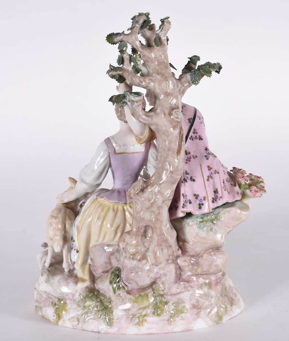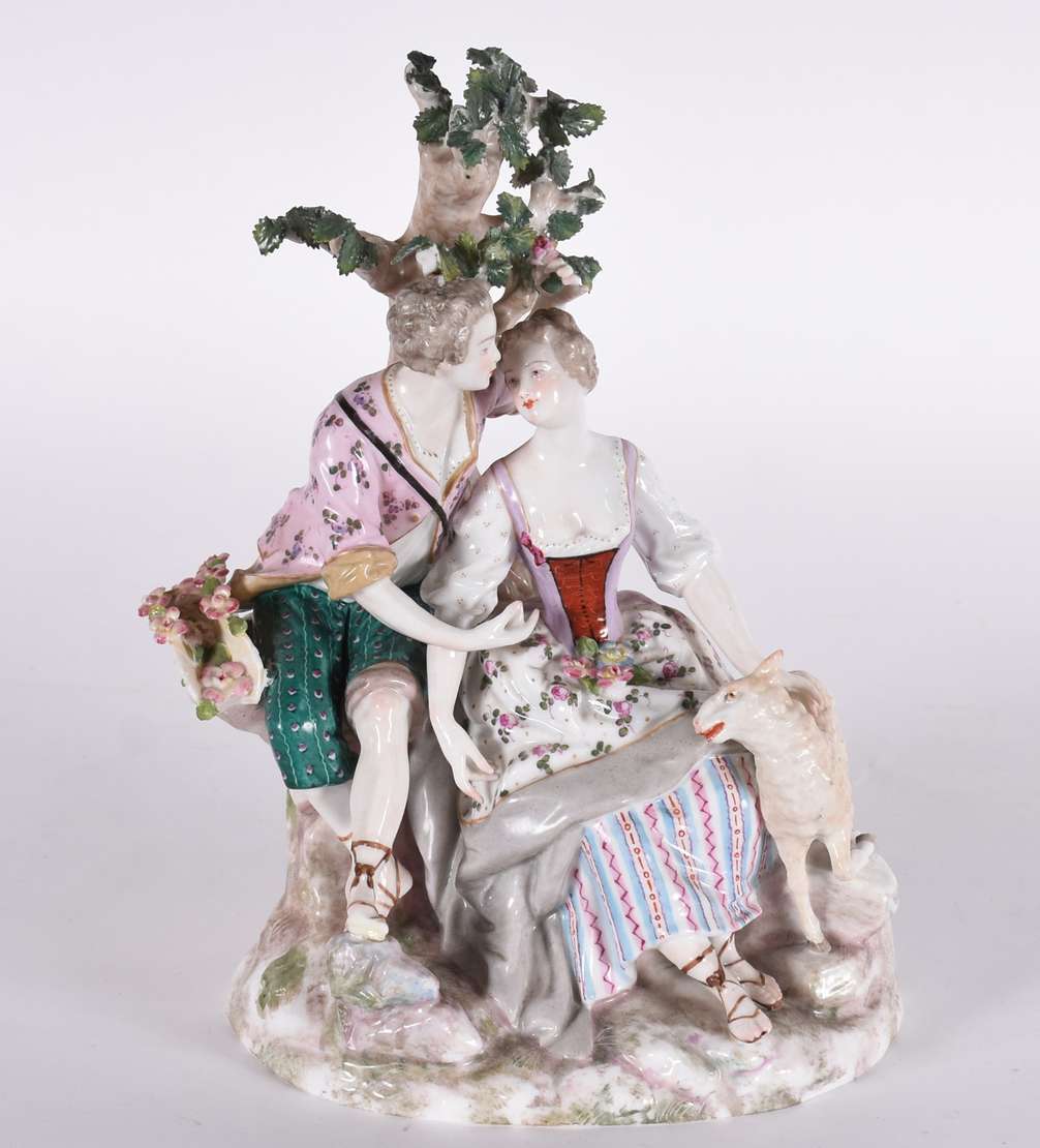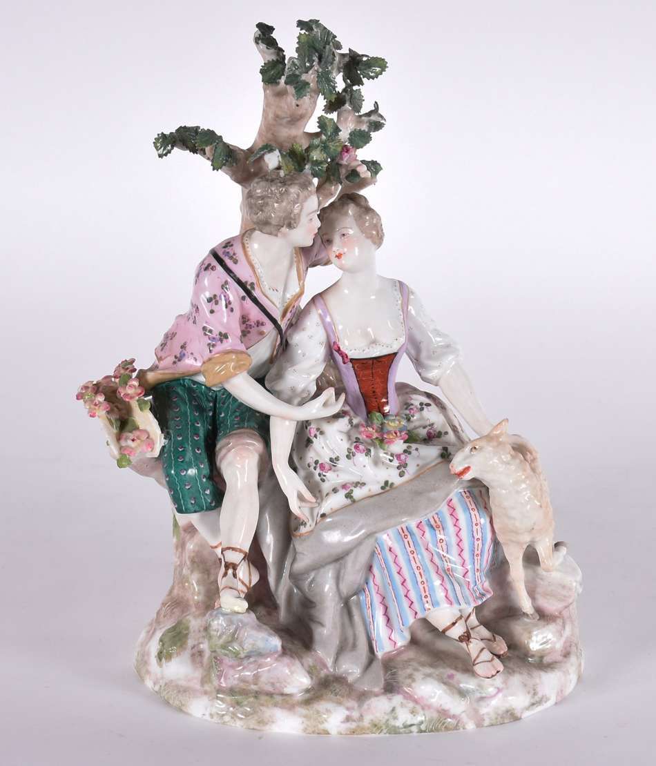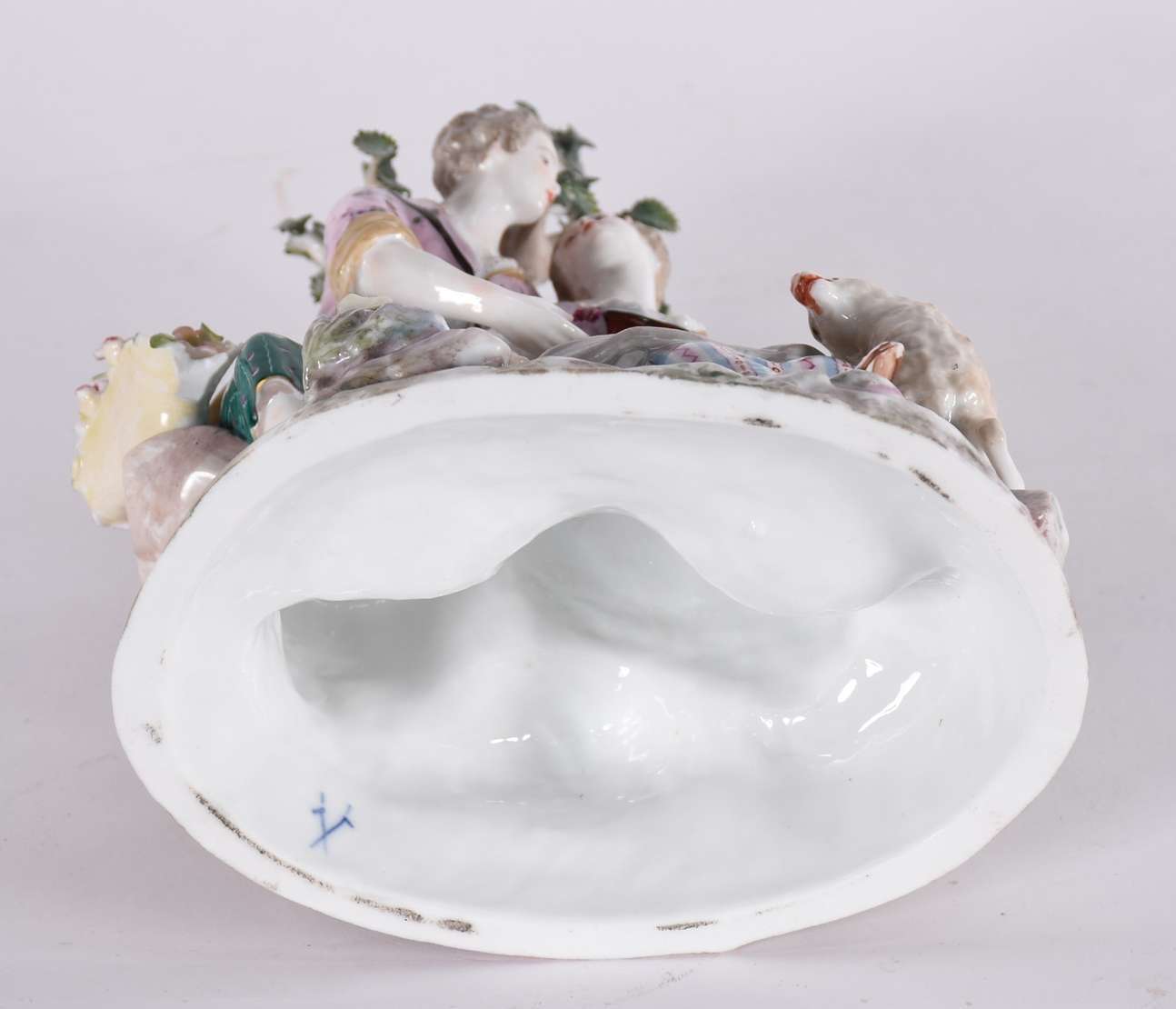Estatueta de porcelana representando dama com cachorro.