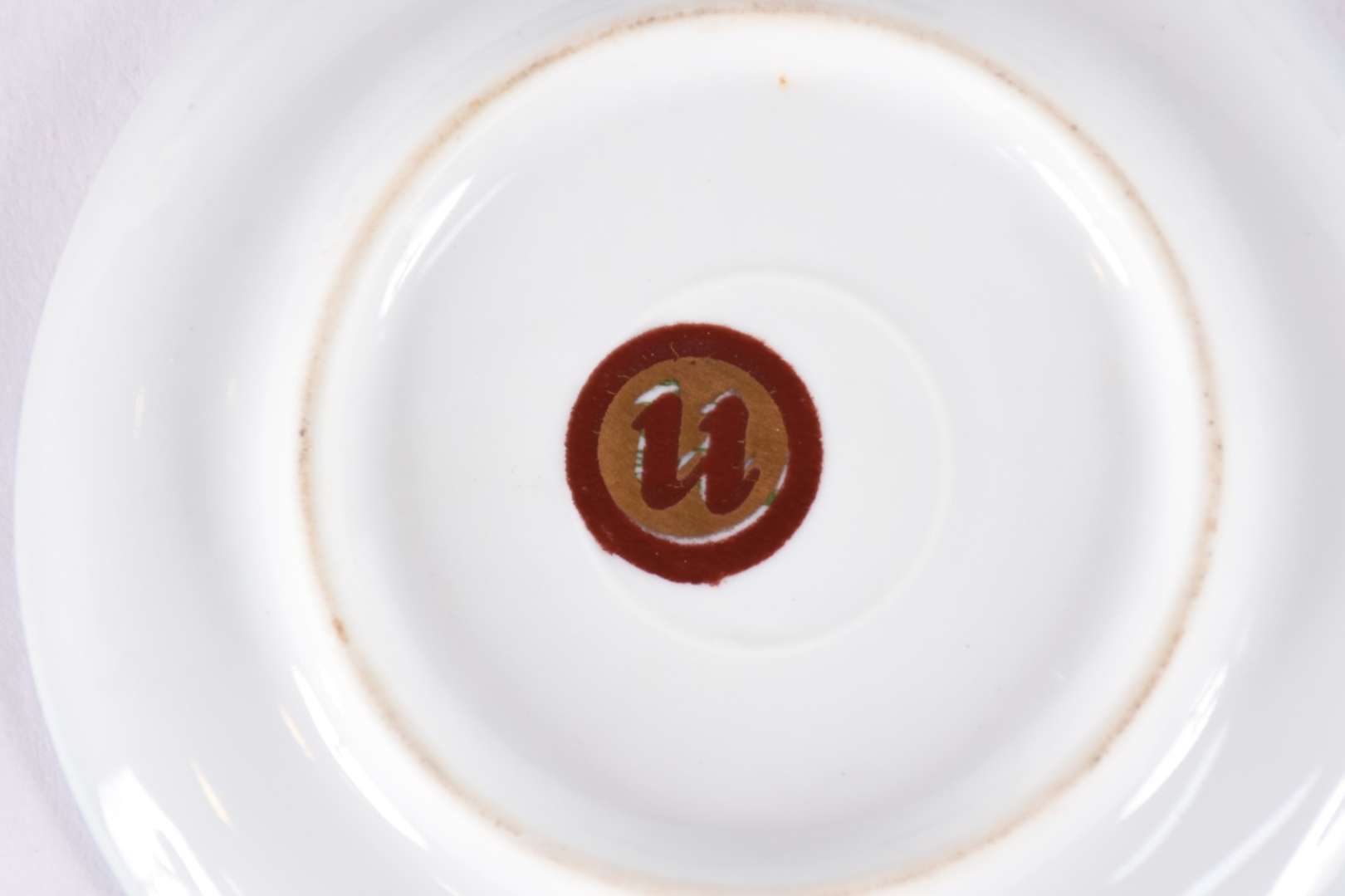 Mesa auxiliar de madeira nobre, tampo marchetado com gradinha de metal, duas gavetas e pernas cilíndricas com detalhe...